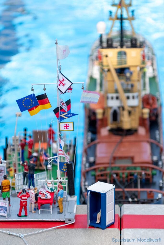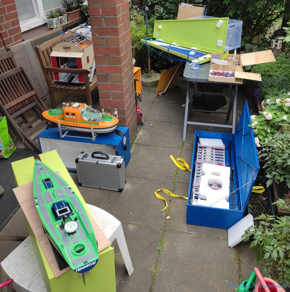 8:45 angekommen, das Auffahren auf den Platz zum Ausladen ist dieses Jahr reglementiert (Rettungsschutz Auflagen), das macht das Durchkommen mit meinen Kisten etwas leichter. Gegenüber der Einfahrt kann man auch kurz Parken und Ausladen. Wegen Bootshaus und Ponton stehe ich wieder Abseits meines Vereins (SMC Elmshorn) neben der Schwimmbad-Rutsche. Das kleine Eingangsbecken ist wie gewohnt mit der stetig wachsenden Hafenanlage belegt (Wahnsinn). Meinen Aufbau habe ich dieses Mal etwas anders geregelt, erst Bootshaus, dann Segler und schließlich der Seenotretter Ponton mit der WILMA SIKORSKI. Wie schon letztes Mal geht der Aufbau nur langsam voran, weil es immer wieder zu Gesprächen kommt – diesmal bin ich darauf vorbereitet und mache mir keinen Stress.