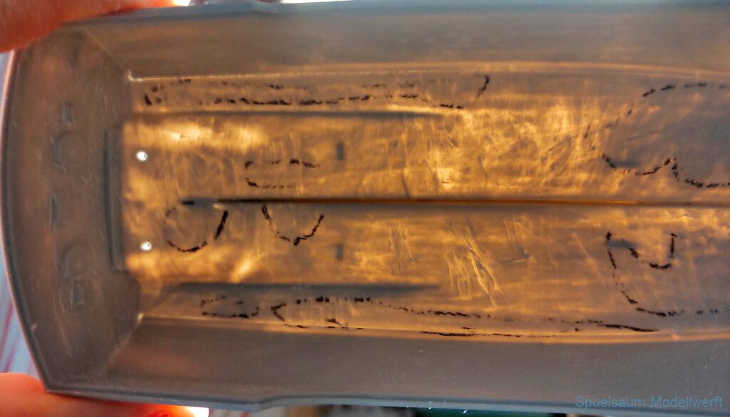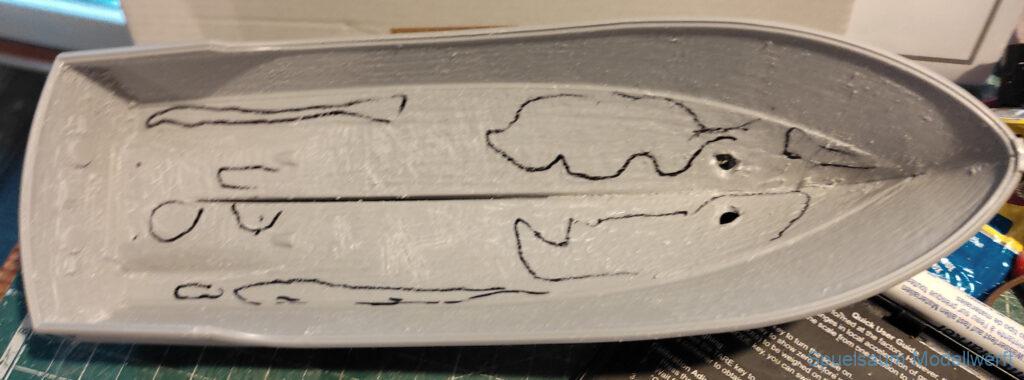 With scratching, cutting and grinding the hull I won somehow 5-8g (I gave up checking at the end). As a RC modeler, RC comes first and then come details. But usually not all details can be seen or will be recognized by just 0,1% of the people.
