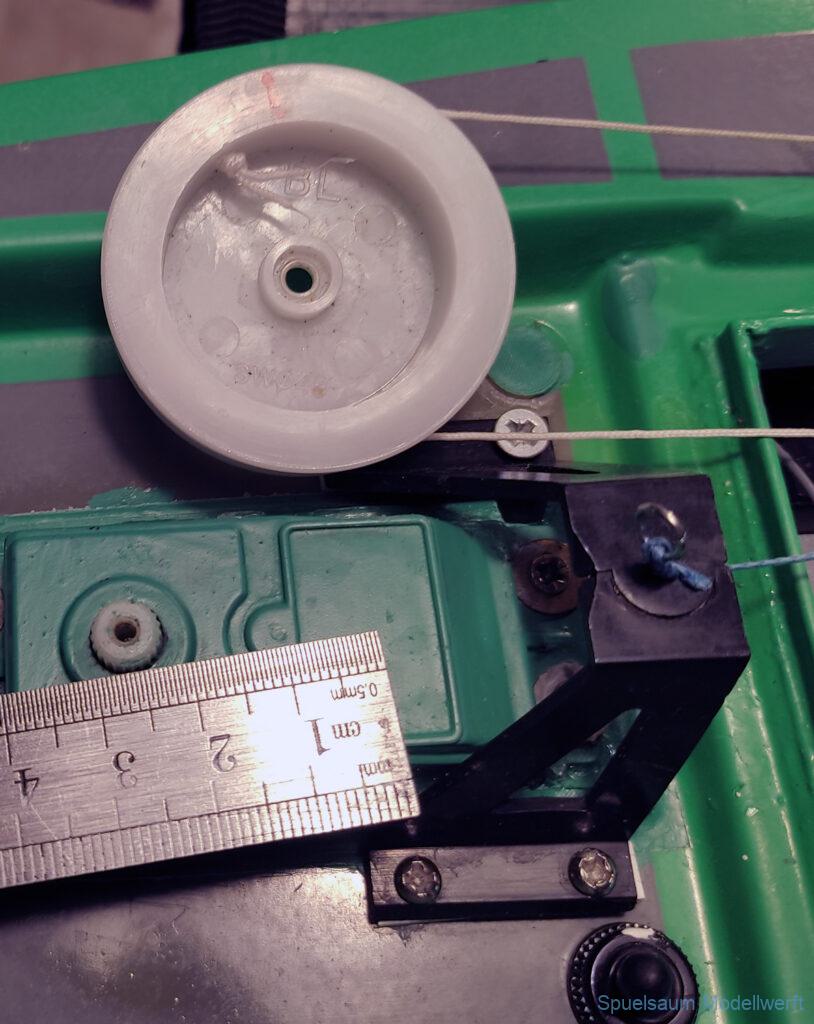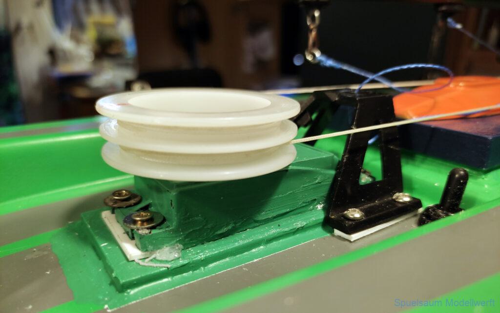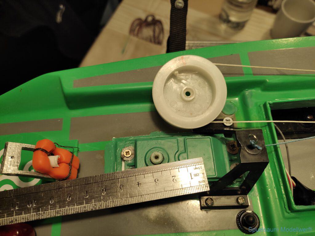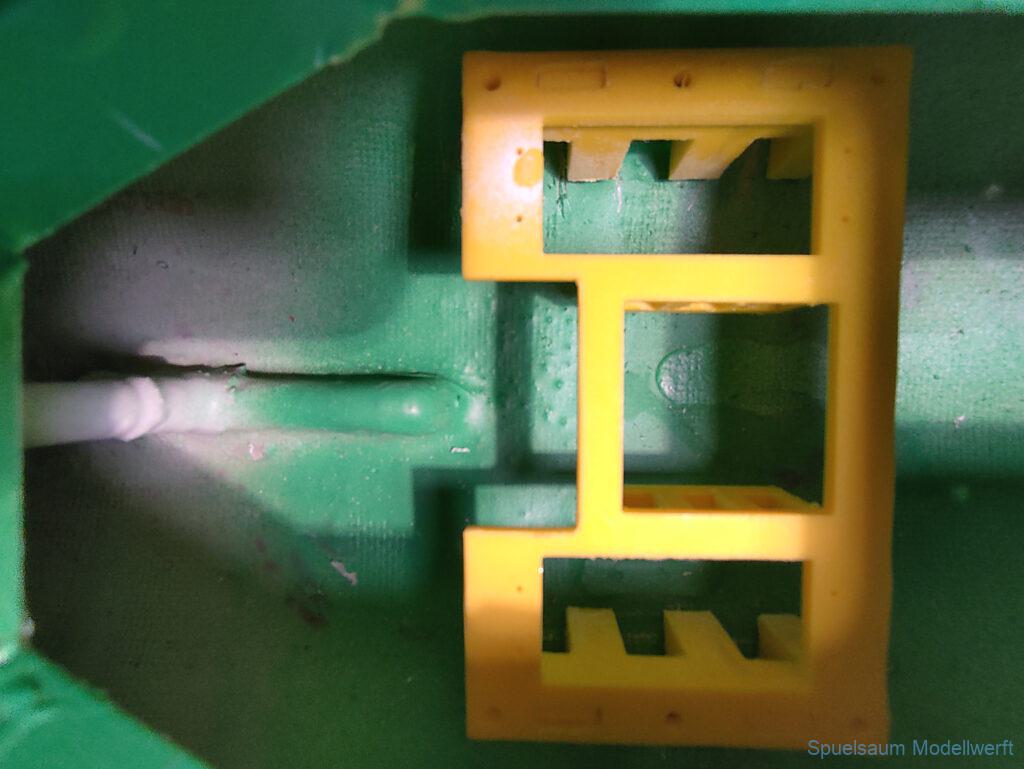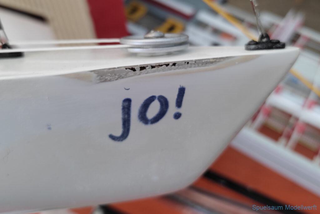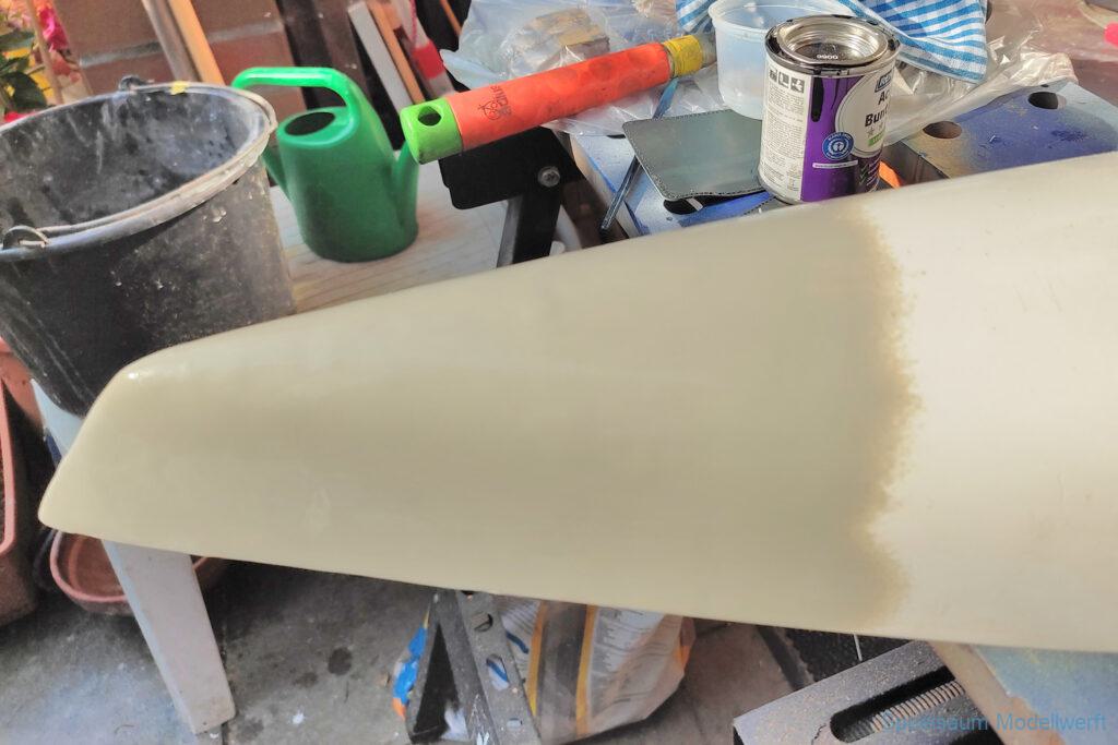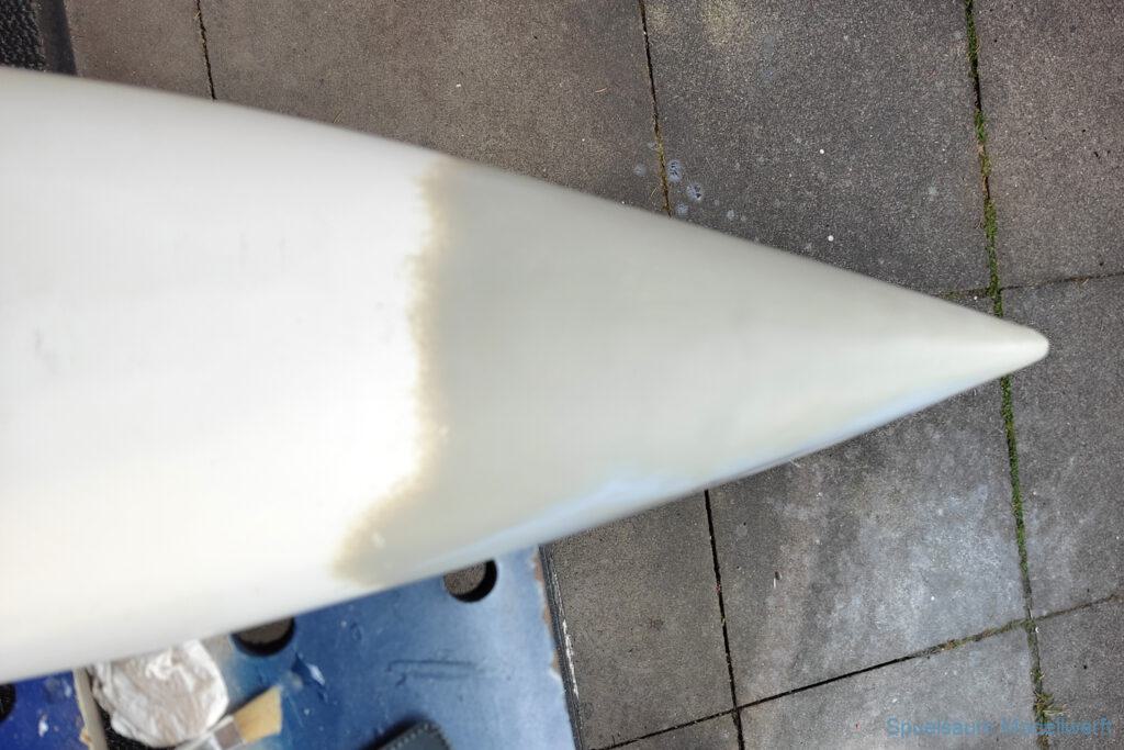 Wieder Zuhause wurde der Rumpf von innen beleuchtet und man konnte sehen, das am Bug einige dünne Kanten waren. Daraufhin wurde der Bugbereich abgeschliffen und mit 50gr Glasfasermatte und Epoxy verstärkt. Ein weiteren kleinen Riss hatte es beim Ruder an Deck, nachdem dieser geklebt war wurde die Ruderbefestigung mit gedrucktem Ring und Deckel geschützt.