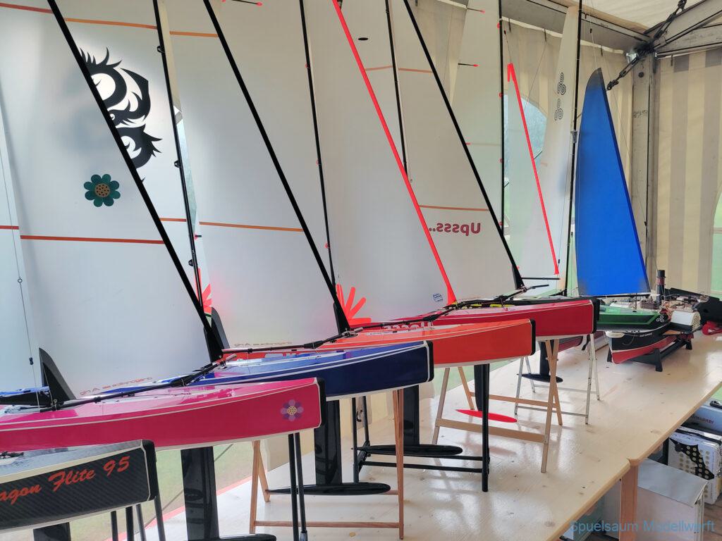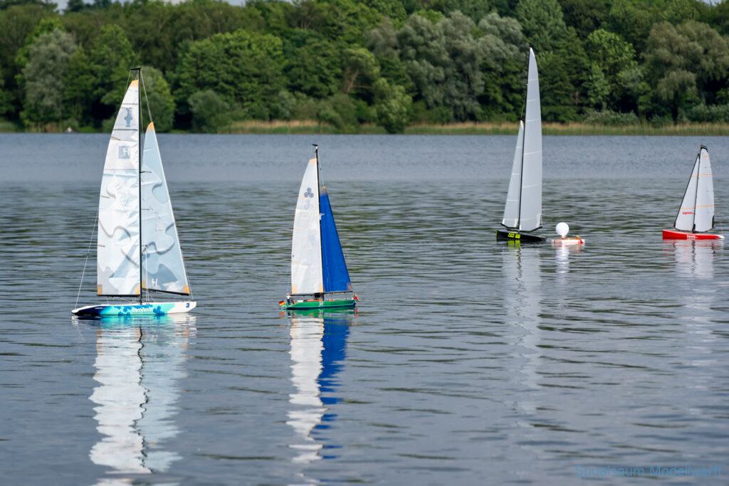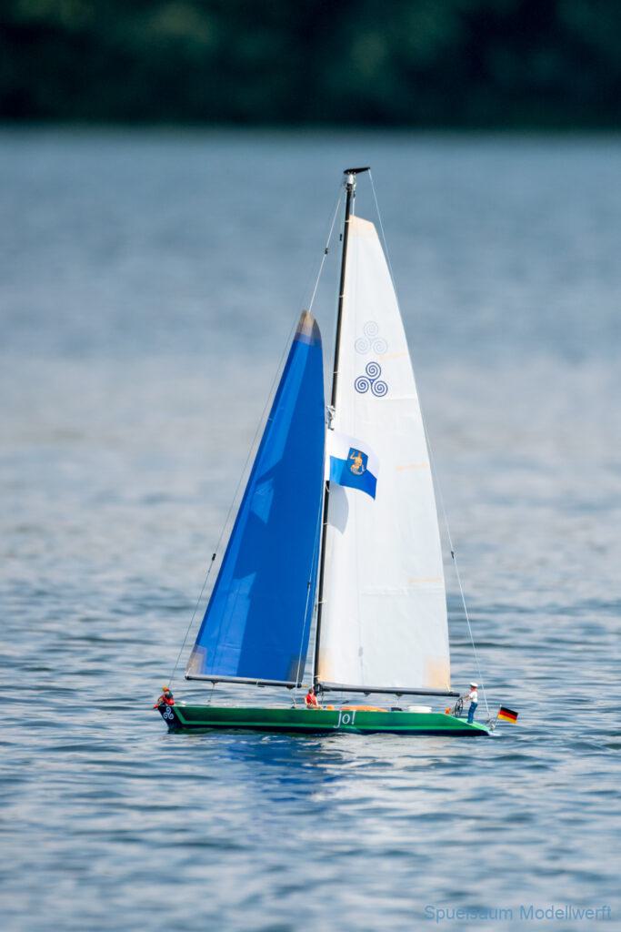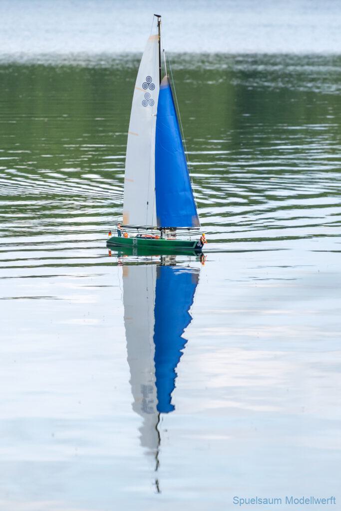 Beim Usertreffen hat Frank mir geholfen (oder sagen wir, ich hab ihm zugeschaut) den Rest Takellage und Tau(chen) anzuschlagen. Dann ging es an den See, Boot ins Wasser gesetzt und es ist losgesegelt, einfach so. Gut eingestellt und da ich mal vor 30 Jahren gesegelt bin ging auch das Eingewöhnen mit der FB sehr schnell (von der üblichen links-rechts Schwäche wenn das Boot auf einen zukommt mal abgesehen).