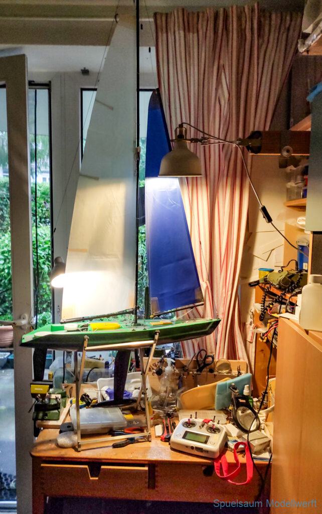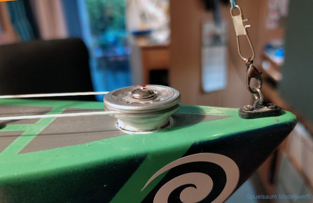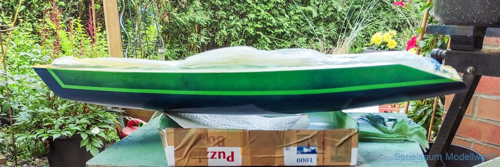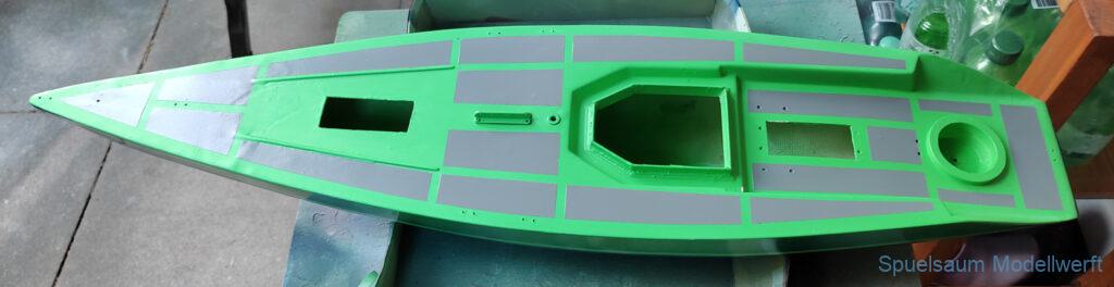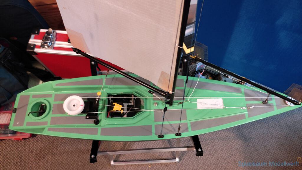 Dann ging es ans Design, mit vorhandenen Farb(Resten) von Molotow Premium wurde das Boot hellgrün mit unregelmäßigem Blau gesprenkelt, das Unterwasserschiff in dunkelblau. An Deck wurden Antirutschflächen mit grauen Farb-Flächen imitiert. Es wurde eine neue Abdeckung für die Kabine gebaut (und später wegen Denkfehler noch einmal optimiert). Die Elektronik bekam ein neues Gestell im Rumpf und die Wanten sind alle mit Schmuckkarabinern befestigt. Diese halten den Druck locker und das Boot lässt sich so schneller auf- und abtakeln.
