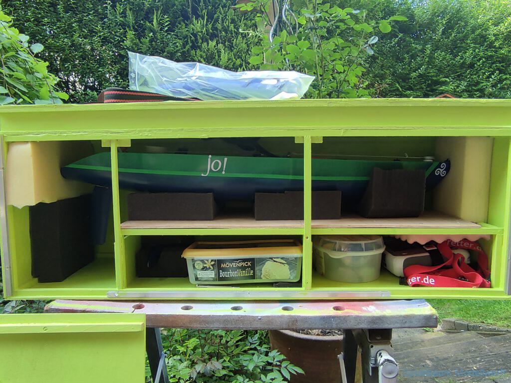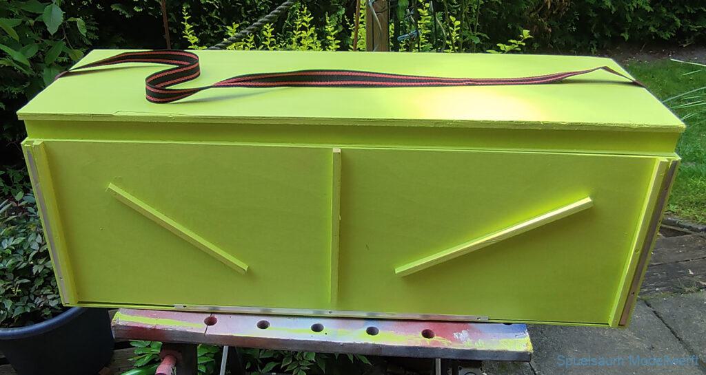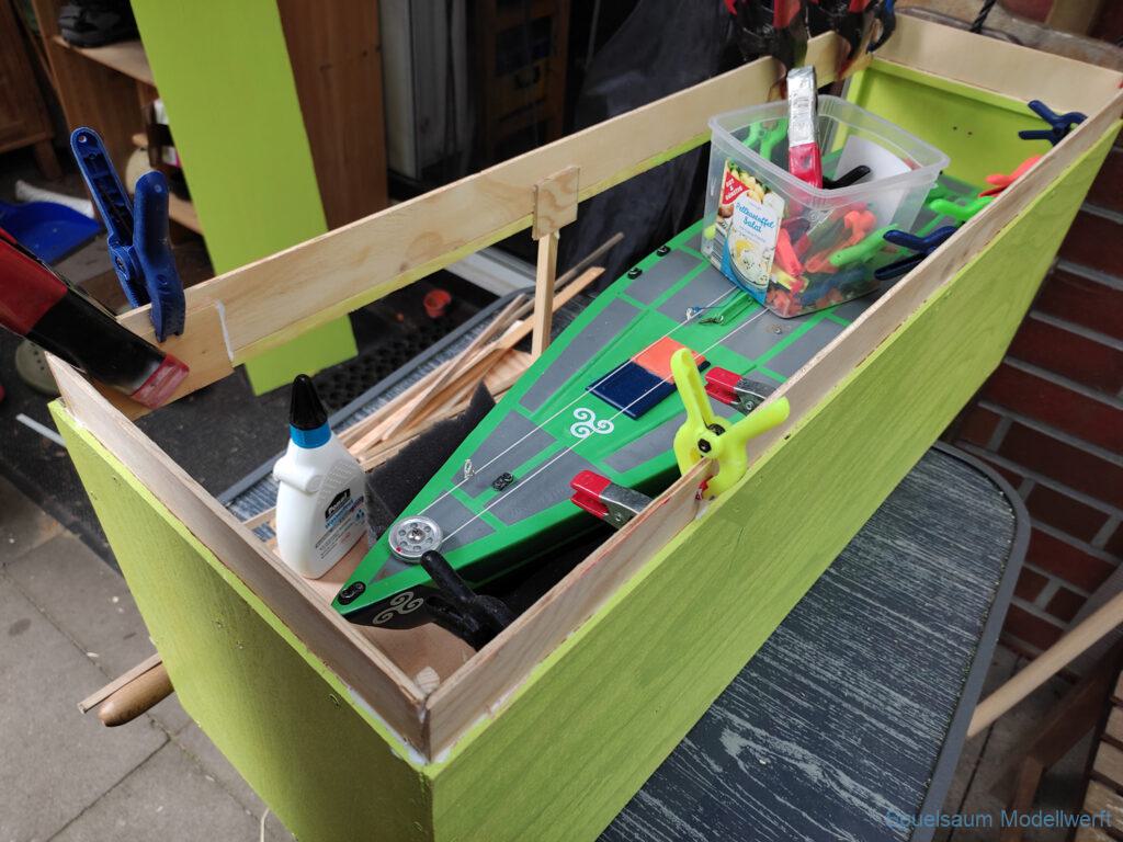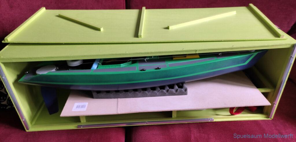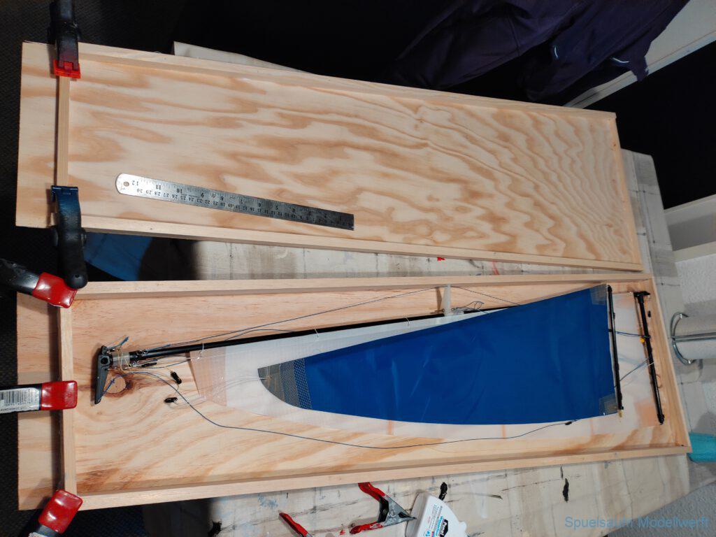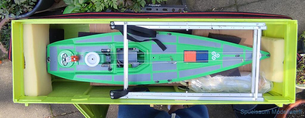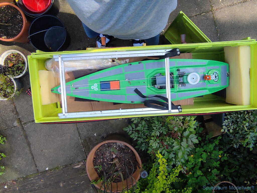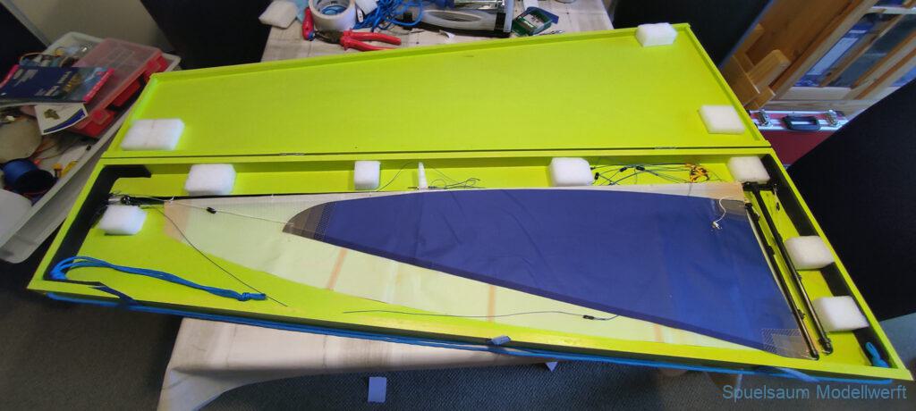 Für die Lagerung un den Transport habe ich eine Kiste gebaut, leider aus Buchensperrholz und damit relativ schwer. Für das Rigg habe ich mich ebenfalls für eine Feste Box entschieden. So lässt es sich sicher lagern und transportieren.