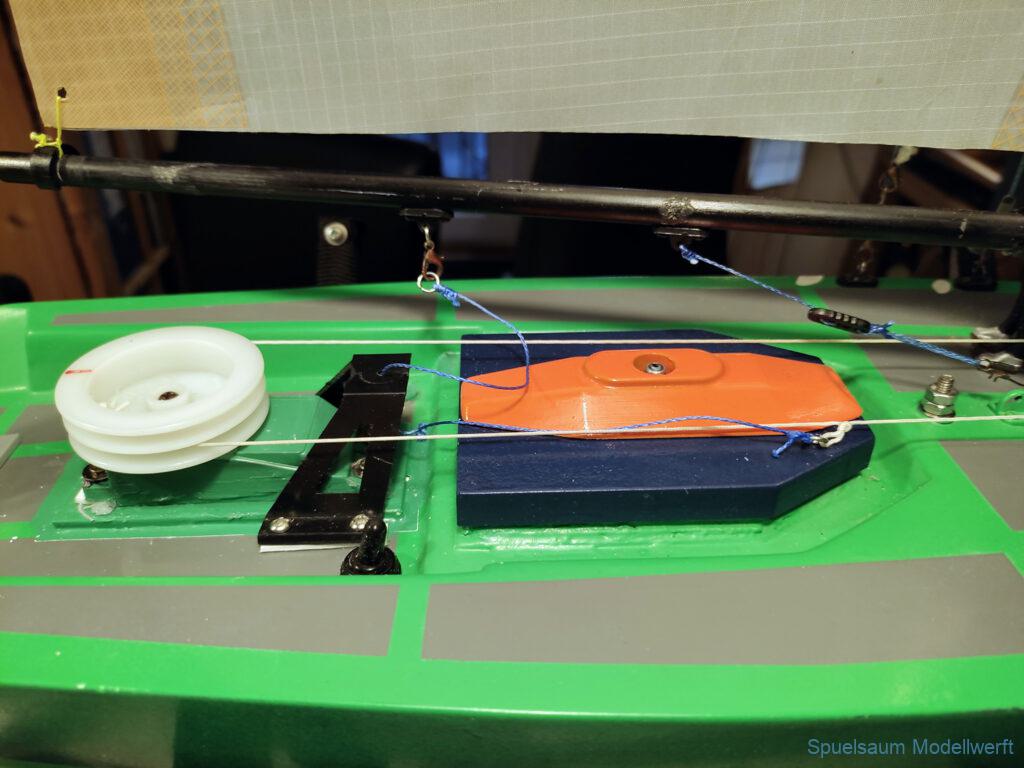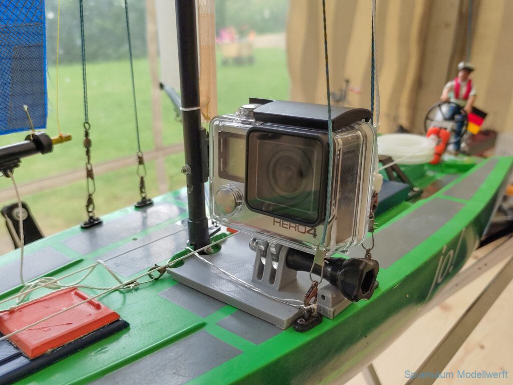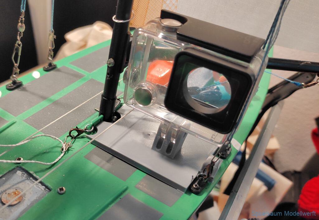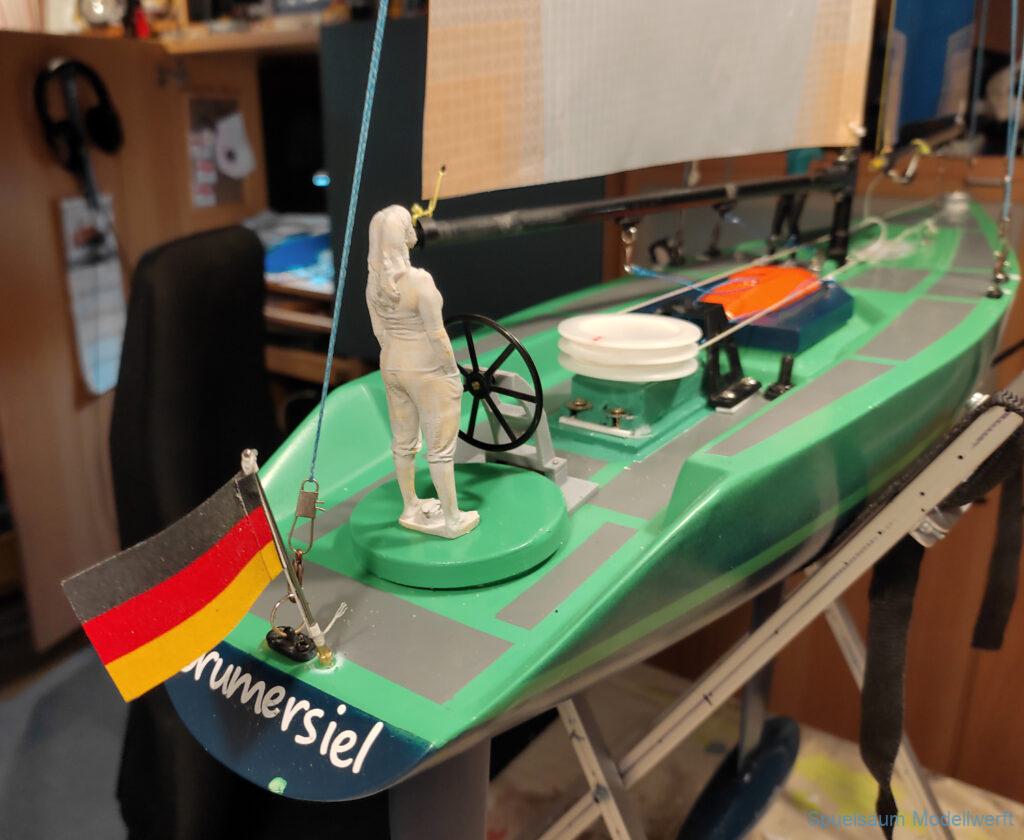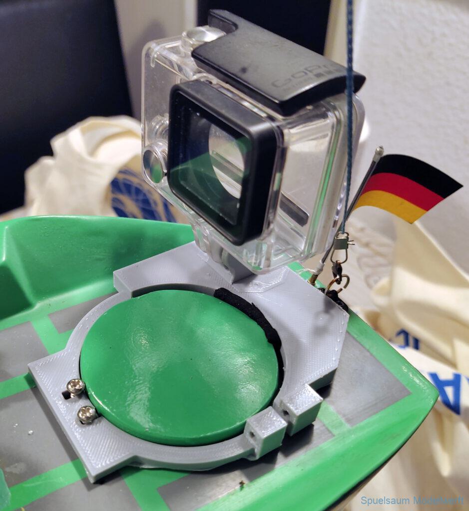 Zum Usertreffen 2024 wurde der erwähnte Fehler im Kajütaufbau geändert. Ausserdem eine Damencrew gedruckt und ein paar Neodym Magnete unter Deck geklebt. Auch ein Flaggenhalter ist dazugekommen. Zwei Halter für eine GoPro, die Umlaufräder wurden etwas erhöht. Und schließlich musste die Transportbox etwas erhöht werden um keine Probleme mit dem Steuer am Heck zu bekommen.