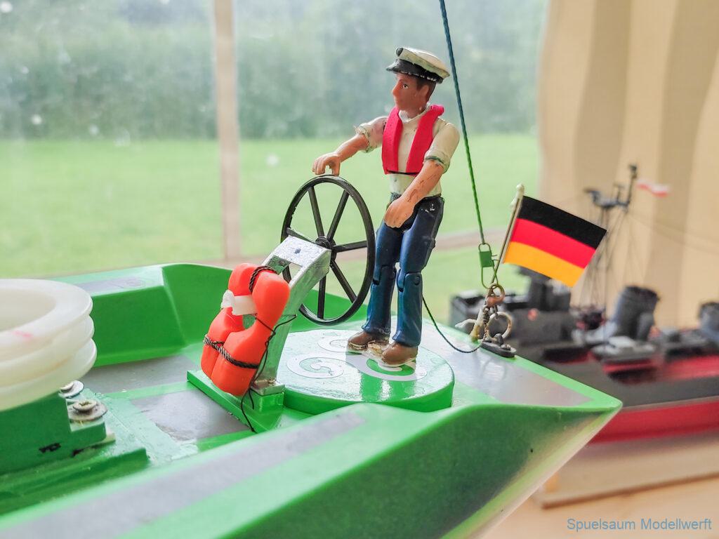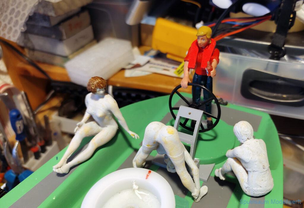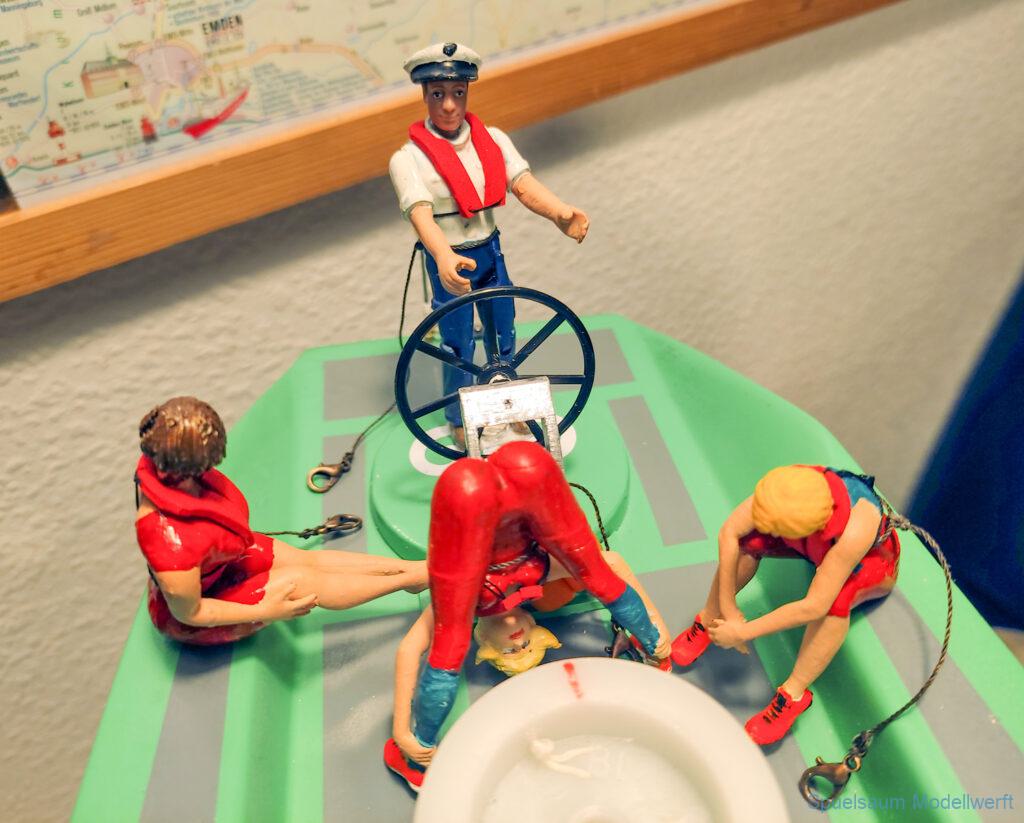 Die Figuren haben alle eine Rettungsweste und sind mit einer Sicherungsleine am Boot eingehakt, wie es sich gehört.
