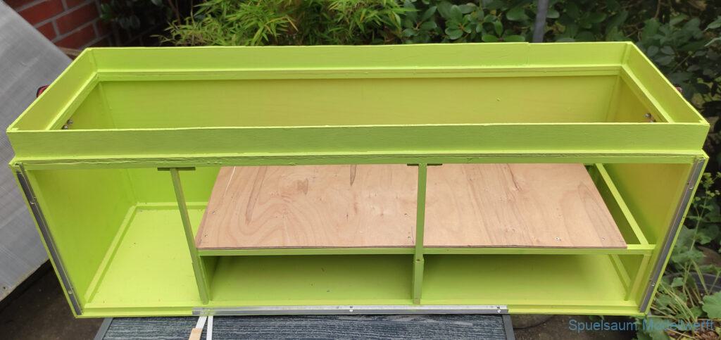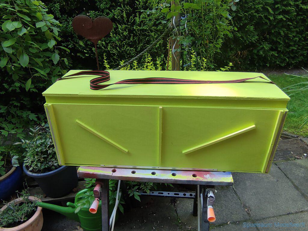 Die Kiste kann man jetzt von der Seite und von Oben öffnen. Der Ständer passt auch noch oben mit hinein.