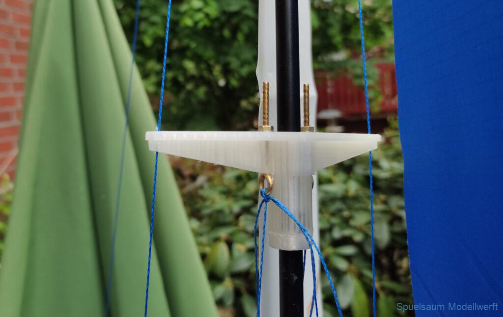 Die Sahling ist beim Druck etwas groß ausgefallen. Hier ist ein Durchmessertestring auf den unteren Mast geklebt darauf das gedruckte Teil mit UHU-hart (bekommt man leichter wieder ab) und das obere Mastteil wird nur gesteckt.