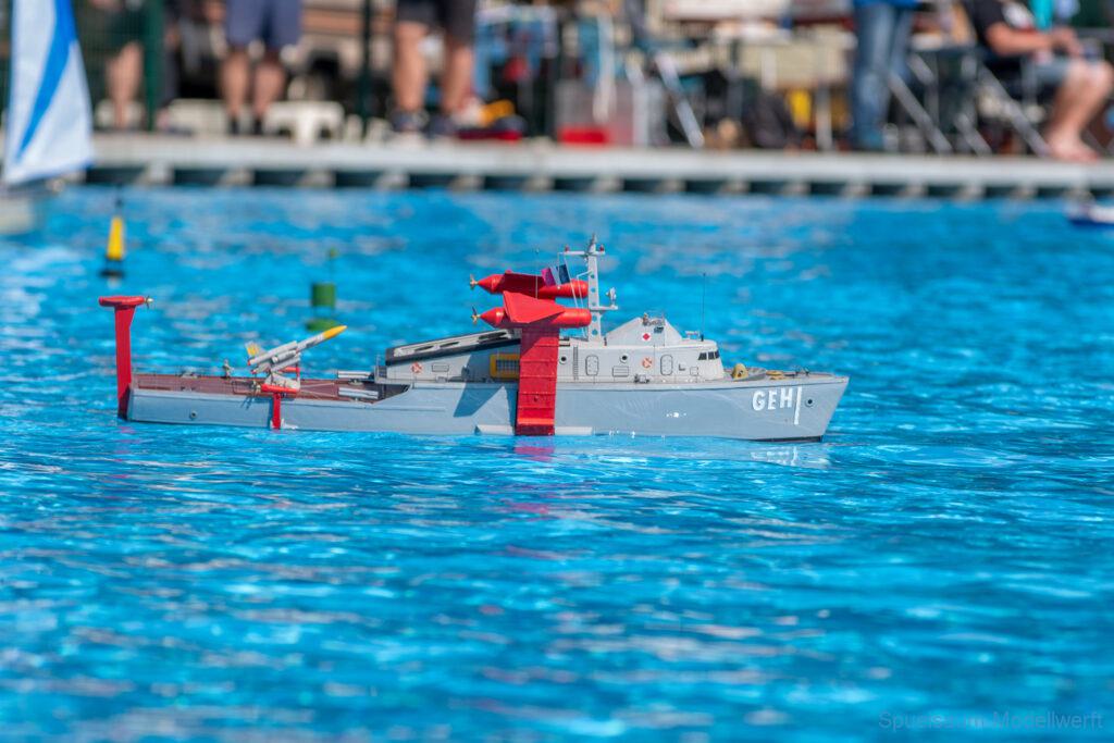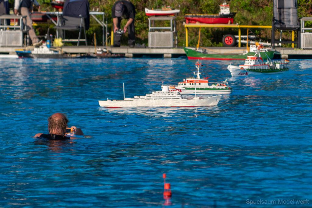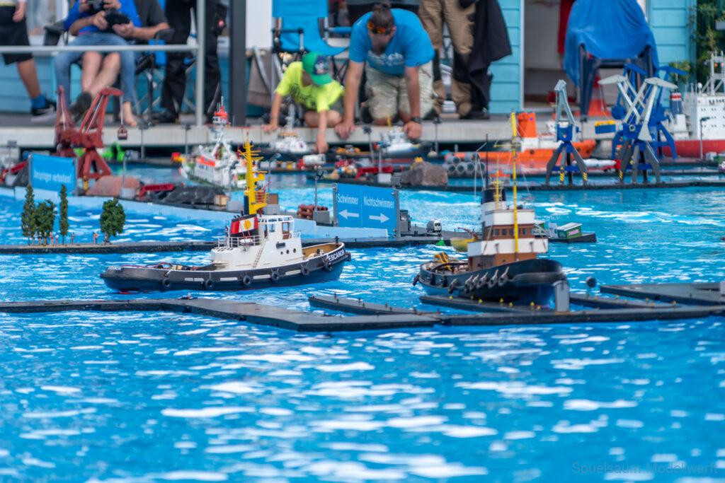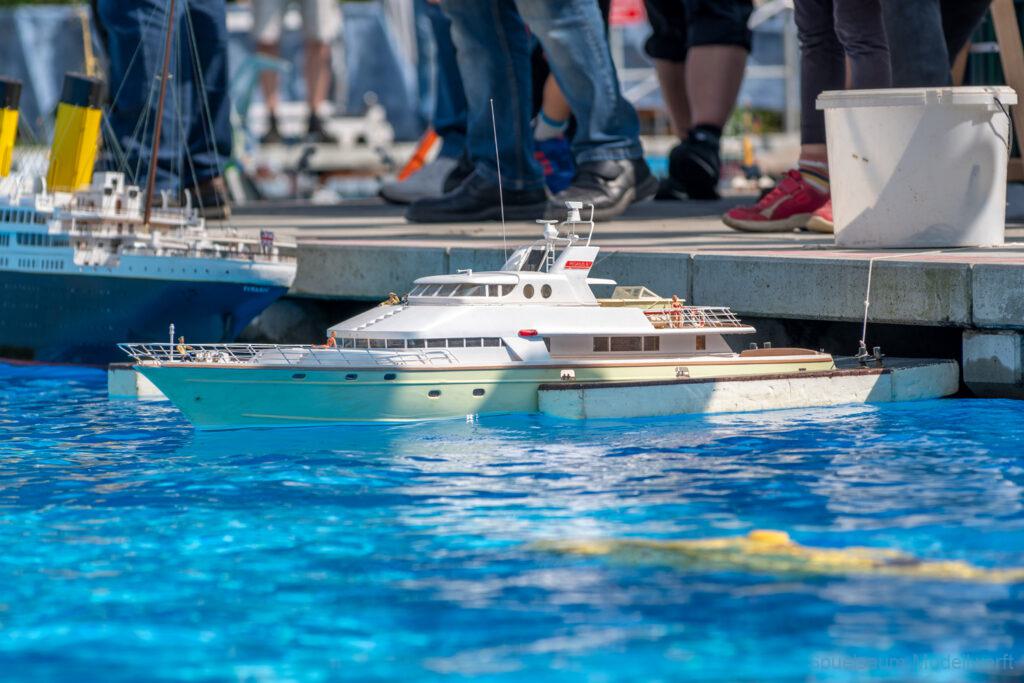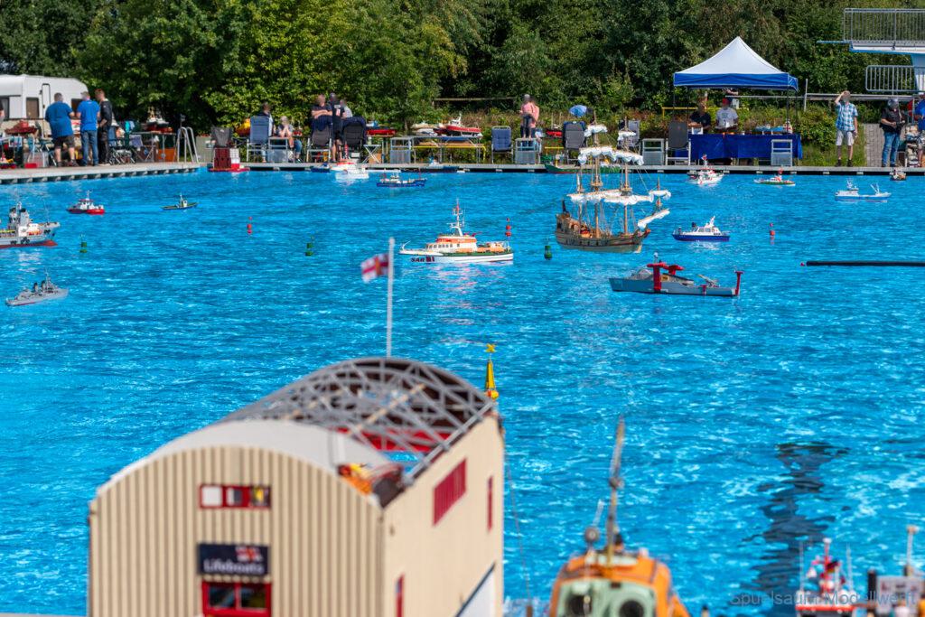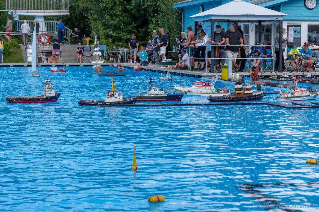 Zwischendurch geht’s immer mal wieder ums Schwimmbecken oder über den Platz, natürlich auch zum Kiosk. Dabei ergeben sich viele nette Gespräche über die ausgestellten Schiffe (am Ende, wie immer, viel zu wenige). Fotos habe ich diesmal nur begrenzt gemacht, meist nur wenn ich für mich oder auf Anfrage Schiffe fotografiert habe. Wer zu der Zeit günstig im Wasser war ist dann draufgekommen. Die Auswahl ist also keine Wertung sondern überwiegend Zufall.