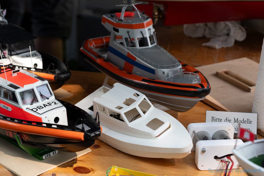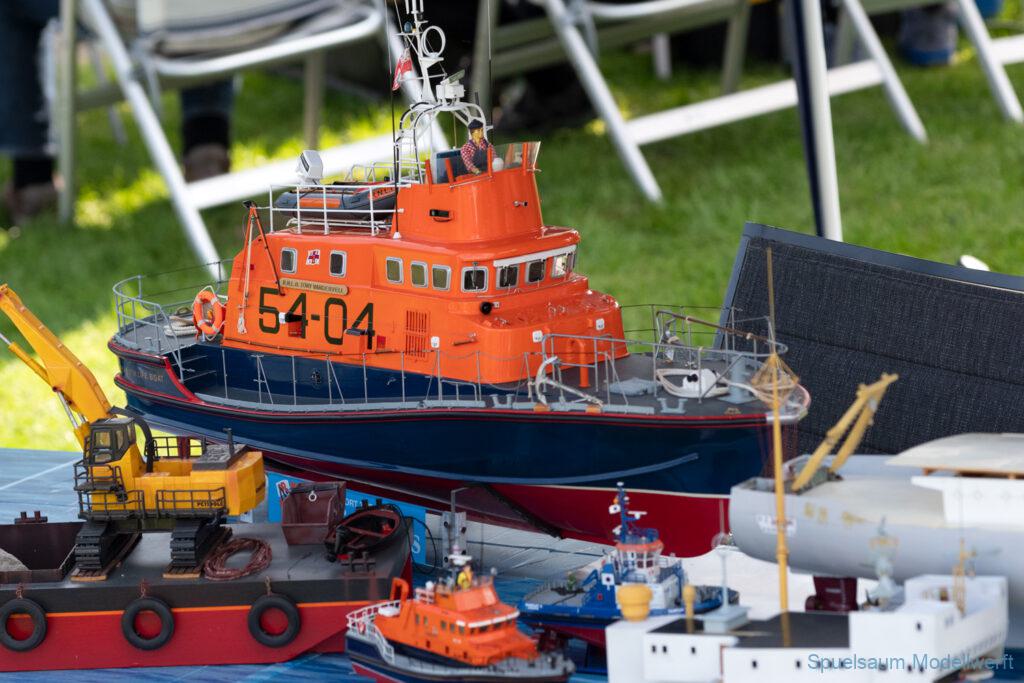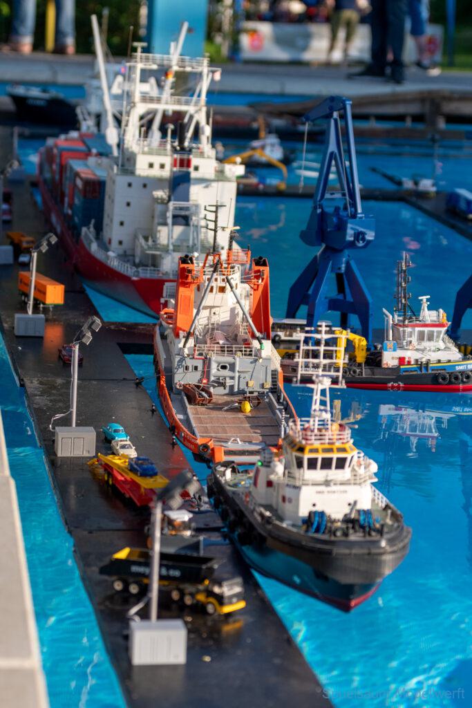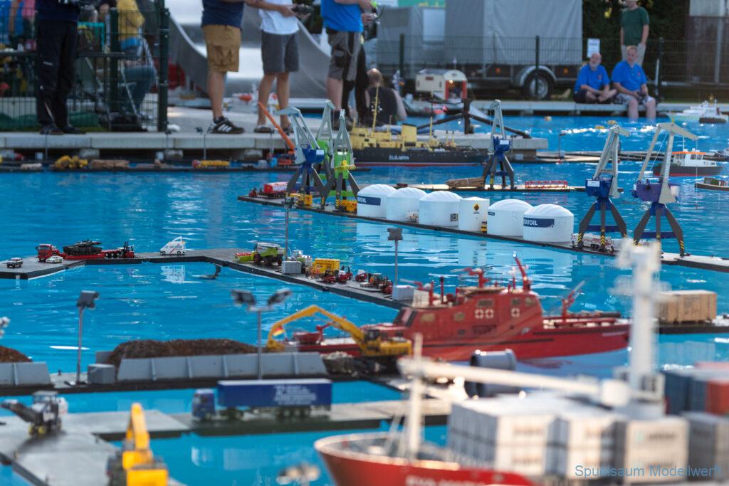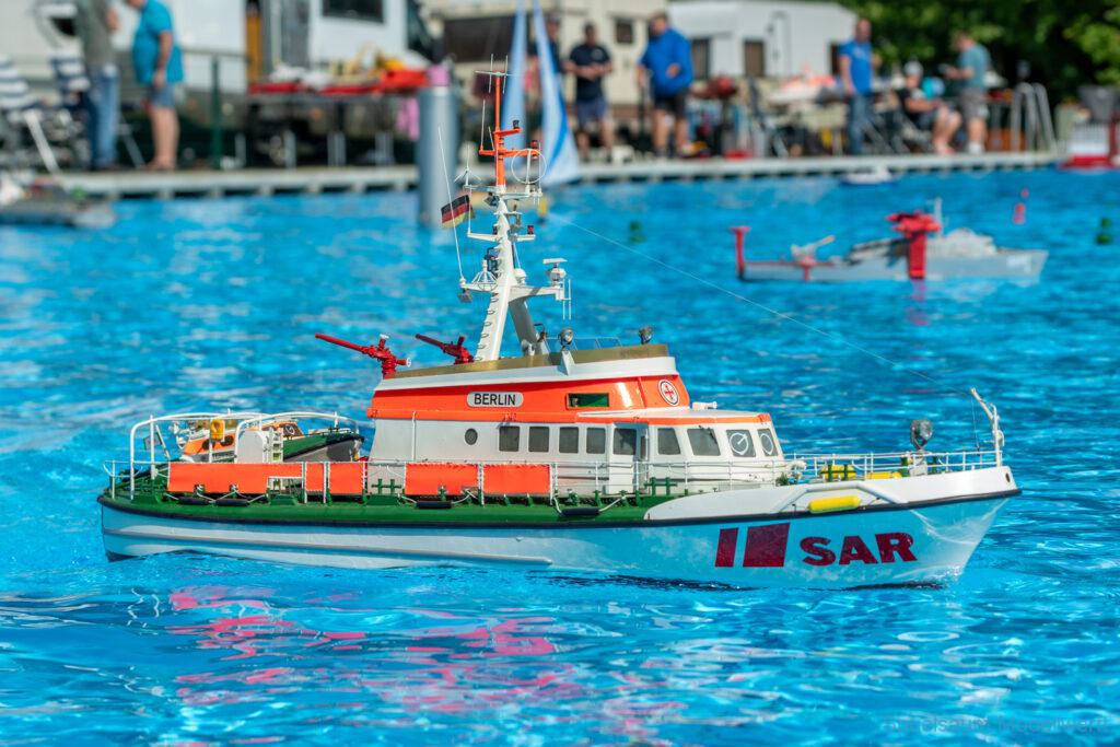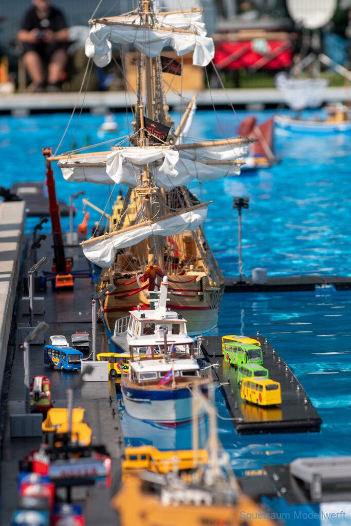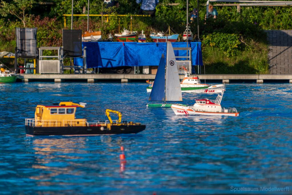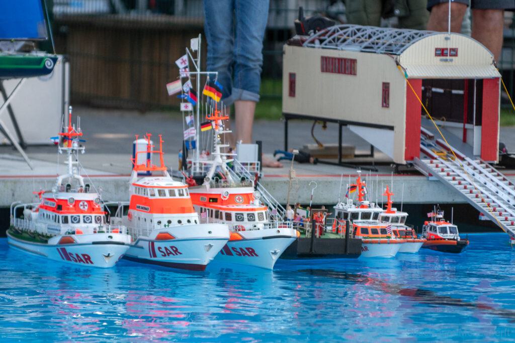 8:45 angekommen, das Auffahren auf den Platz zum Ausladen ist dieses Jahr reglementiert (Rettungsschutz Auflagen), das macht das Durchkommen mit meinen Kisten etwas leichter. Gegenüber der Einfahrt kann man auch kurz Parken und Ausladen. Wegen Bootshaus und Ponton stehe ich wieder Abseits meines Vereins (SMC Elmshorn) neben der Schwimmbad-Rutsche. Das kleine Eingangsbecken ist wie gewohnt mit der stetig wachsenden Hafenanlage belegt (Wahnsinn). Meinen Aufbau habe ich dieses Mal etwas anders geregelt, erst Bootshaus, dann Segler und schließlich der Seenotretter Ponton mit der WILMA SIKORSKI. Wie schon letztes Mal geht der Aufbau nur langsam voran, weil es immer wieder zu Gesprächen kommt – diesmal bin ich darauf vorbereitet und mache mir keinen Stress.