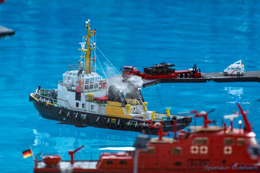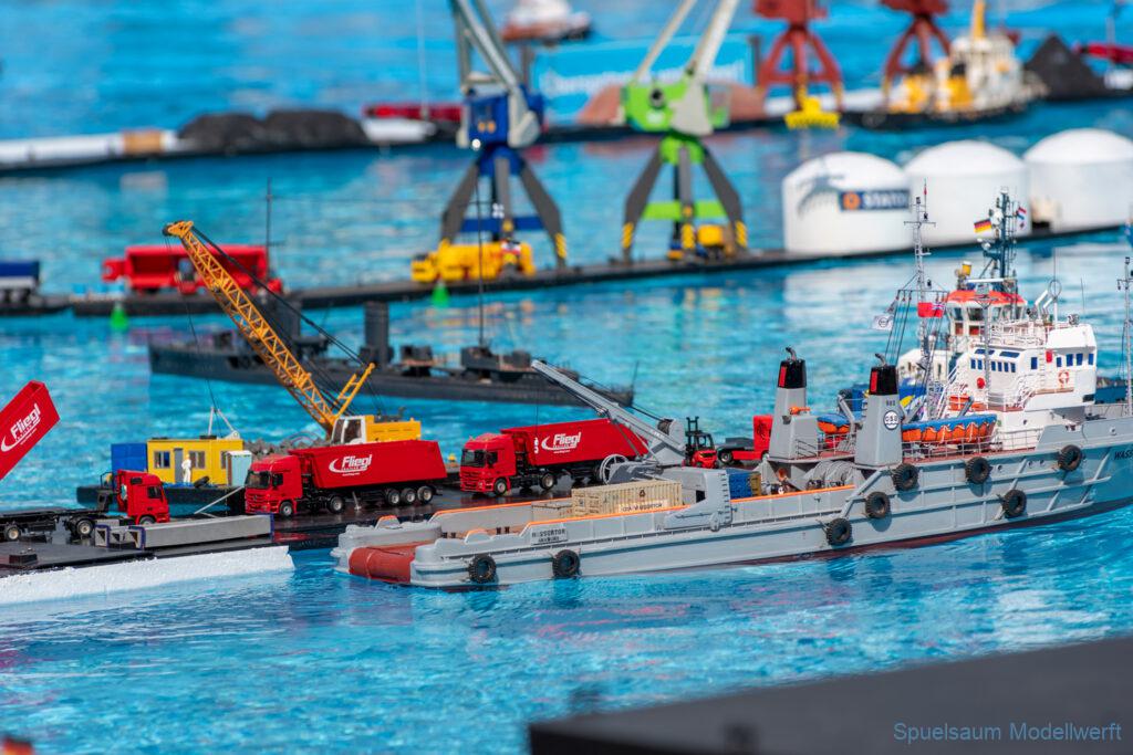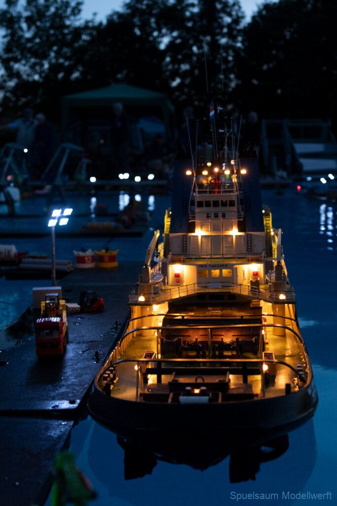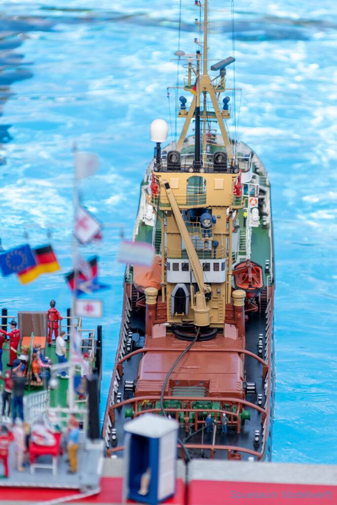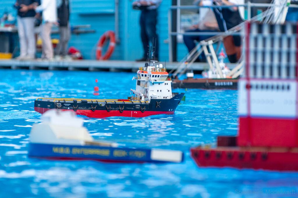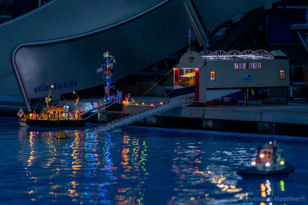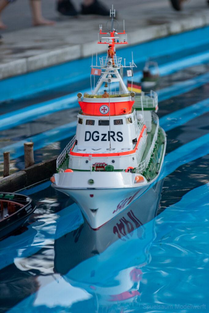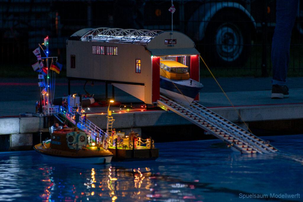 8:45 angekommen, das Auffahren auf den Platz zum Ausladen ist dieses Jahr reglementiert (Rettungsschutz Auflagen), das macht das Durchkommen mit meinen Kisten etwas leichter. Gegenüber der Einfahrt kann man auch kurz Parken und Ausladen. Wegen Bootshaus und Ponton stehe ich wieder Abseits meines Vereins (SMC Elmshorn) neben der Schwimmbad-Rutsche. Das kleine Eingangsbecken ist wie gewohnt mit der stetig wachsenden Hafenanlage belegt (Wahnsinn). Meinen Aufbau habe ich dieses Mal etwas anders geregelt, erst Bootshaus, dann Segler und schließlich der Seenotretter Ponton mit der WILMA SIKORSKI. Wie schon letztes Mal geht der Aufbau nur langsam voran, weil es immer wieder zu Gesprächen kommt – diesmal bin ich darauf vorbereitet und mache mir keinen Stress.