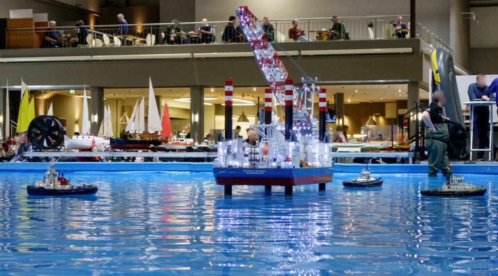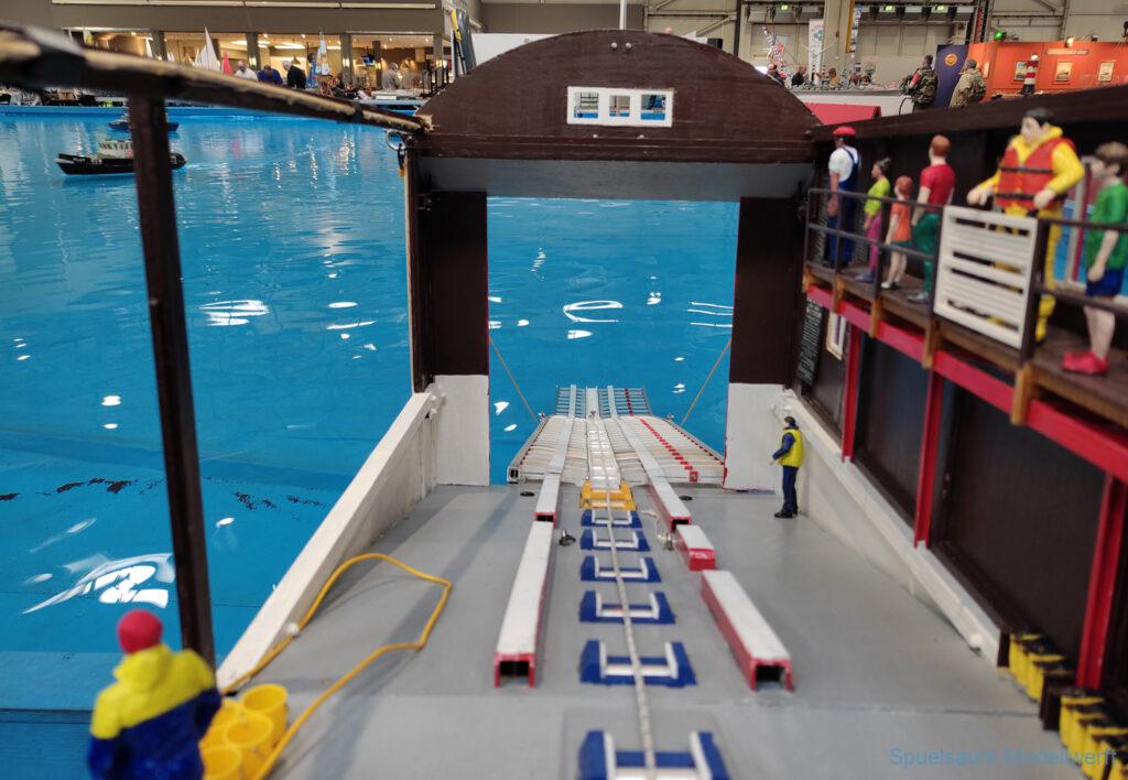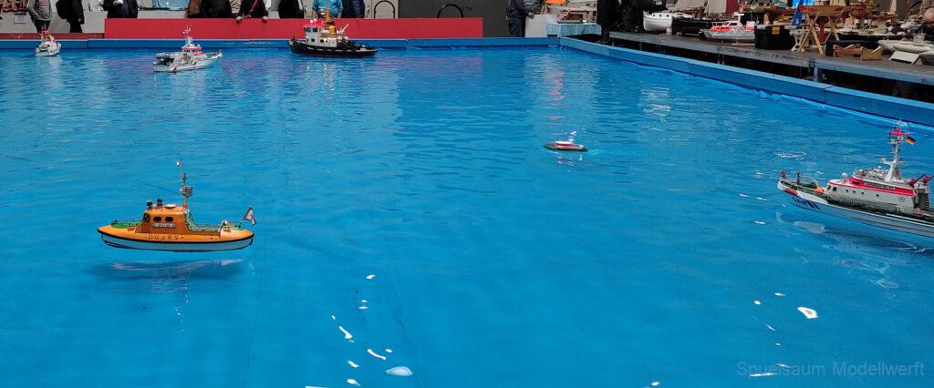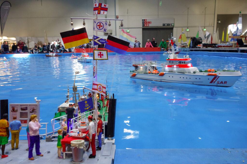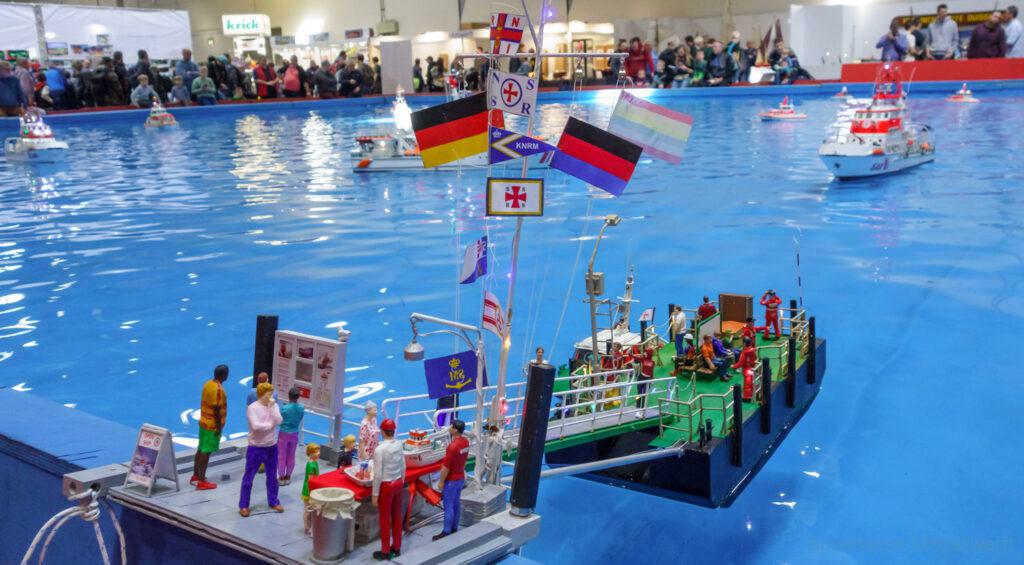 Das große Wasserbecken war morgens zu Beginn und abends zum Ende frei befahrbar. Zeit um für mich das Bootshaus auszuprobieren auch Christian hat ein paar seiner Schiffe auf dem Wasser gehabt. Dazu mit der GESINA und dem Ponton + MAX CARSTENSEN an den Vorführungen der ehrenamtlichen Seenootretter teilgenommen. Daß ab Tag 3 der Ponton extra nachgefragt wurde ist natürlich ein kleiner Ritterschlag.