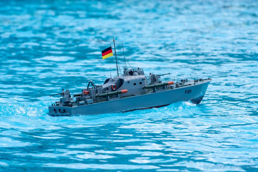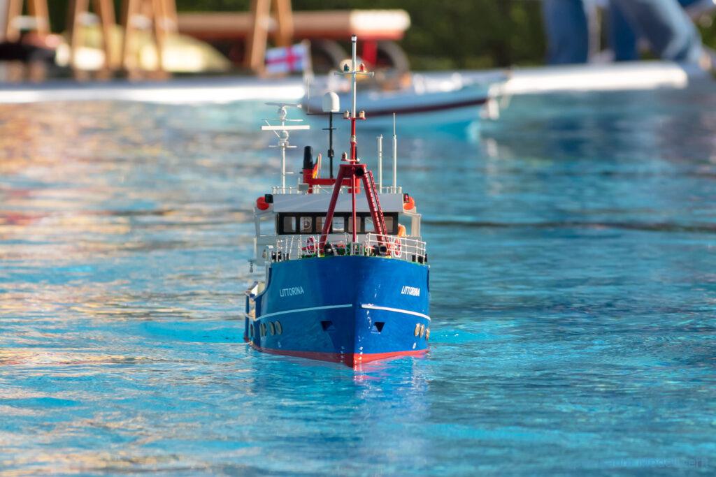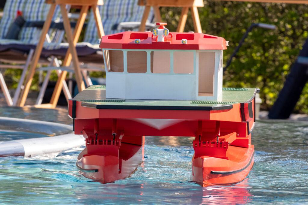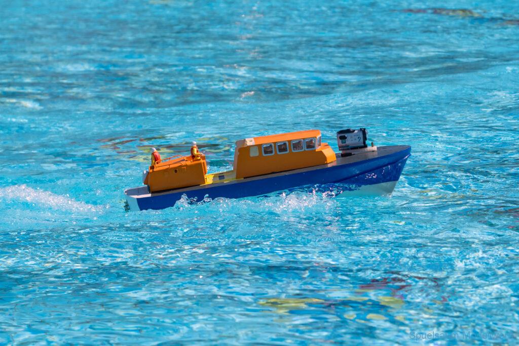 Eigentlich hatte ich die Kiele des Tyne extra frisch lackiert damit sie besser gleiten. Das war (mit etwas Hoffnung) aber noch zu frisch und nicht ganz durchgetrocknet. Es gleitete nämlich gar nix – ein echter Misserfolg. Aber für Spaß und angeregte Diskussionen und Unterhaltungen reicht das Bootshaus dann auch. Funktioniert hat meine Freitag gedruckte Kamerahalterung für Subwaterfilm Holger. Ich hoffe von den Aufnahmen kann er etwas verwenden. Wenn auch das sliden nicht klappte, im Wasser machte das Tyne eine gute Figur, die Bugwelle sah aus wie sie soll, die Geschwindigkeit passt und auch der Verbrauch hält sich in Grenzen, 3500mAh mußte ich am Ende wieder reinpumpen, 10Ah stehen den beiden Motoren zur Verfügung. Etwas tiefer geht’s am Bug noch, aber bei den Fotos war der kleine Zweitakku nicht im Boot.