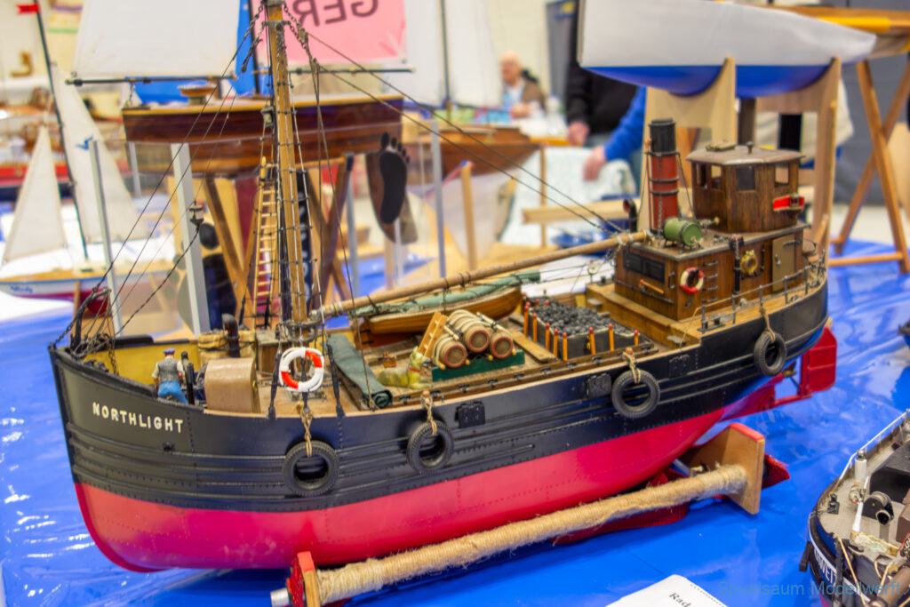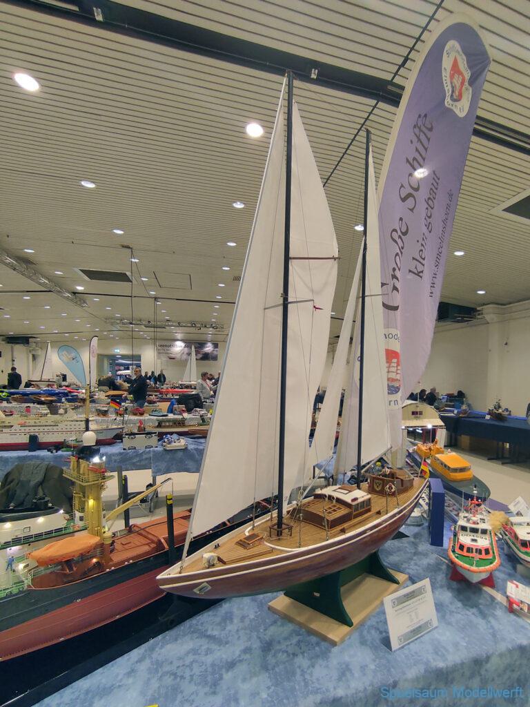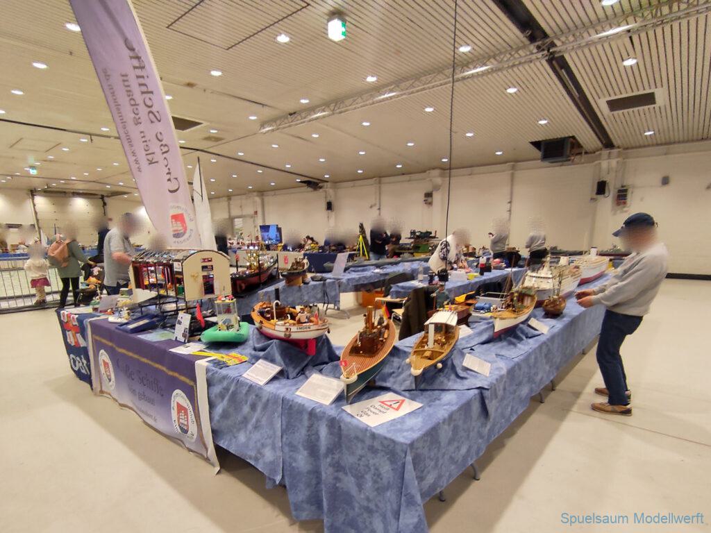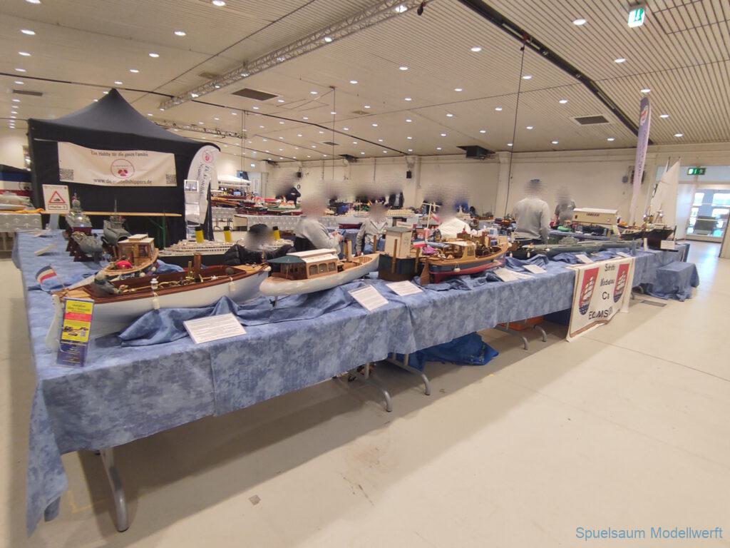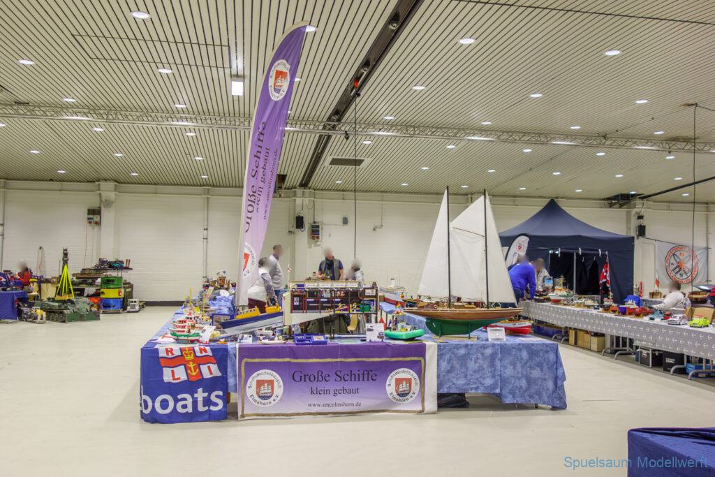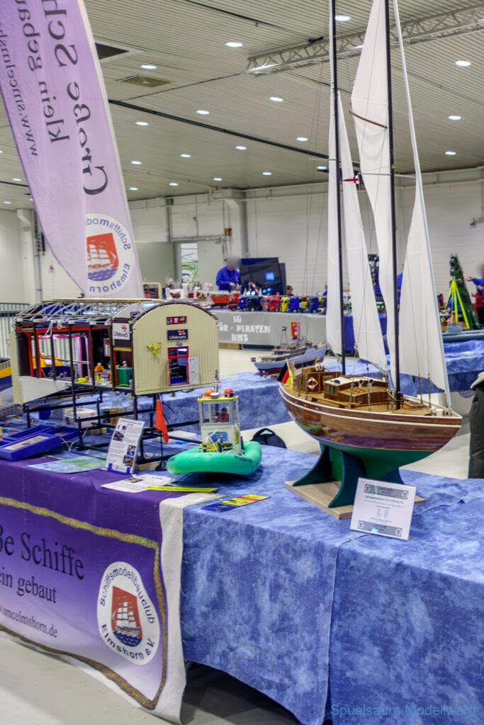Ich habe wie immer mit dem SMC Elmshorn ausgestellt, dieses Jahr an beide Tagen. Prominent an vorderster Front, wobei das in der Halle doch relativ egal ist. Da wir viele große Boote im Verein haben und der Platz natürlich begrenzt ist blieben ca. 2,50m für mich, aber wie man sehen kann schaff ich es ohne Probleme auch diese ‚vollzumüllen‘. Bei mir gibt’s eben nicht nur die Boote sondern auch die Geschichte dazu (und ich hatte nochmehr dabei ;0) ). An Bootshaus hatte sich gegenüber Rostock im November nichts wesentliches geändernt, nur der Release-Haken war in der Montage etwas modifiziert, so daß nur eine Vorführung nicht geklappt hat (von unzähligen). Auch die Funktion der Winde wurde angefragt und vorgeführt. Das laufende Radar des Tyne, noch separat auf dem Tisch, habe ich nur mindestens 6 Mal auseinander genommen um den Getriebemotor zu zeigen. Da werde ich wohl noch ein zweites Radar bauen, nur für Ausstellungen (kein Hexenwerk, einfach nur Getriebemotor und Spannungsregler).