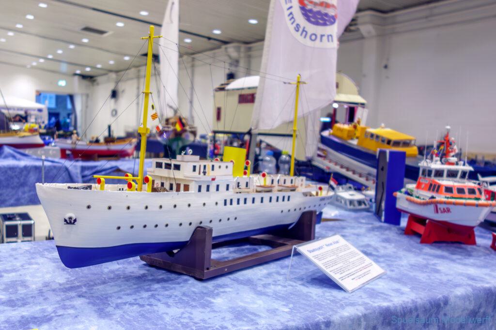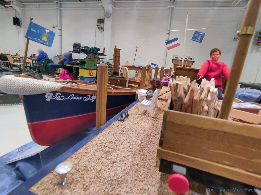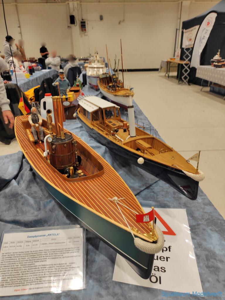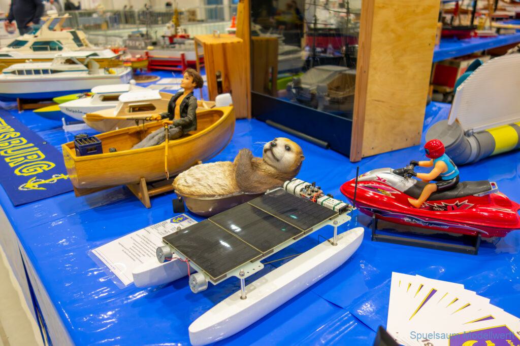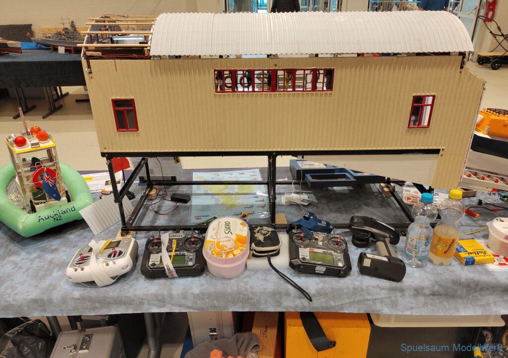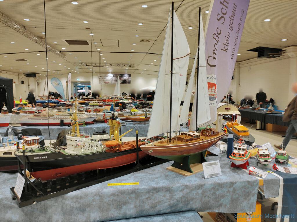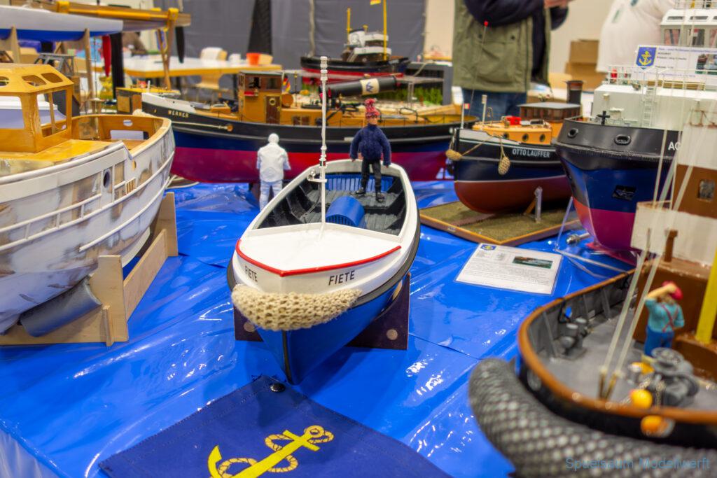 Ich habe wie immer mit dem SMC Elmshorn ausgestellt, dieses Jahr an beide Tagen. Prominent an vorderster Front, wobei das in der Halle doch relativ egal ist. Da wir viele große Boote im Verein haben und der Platz natürlich begrenzt ist blieben ca. 2,50m für mich, aber wie man sehen kann schaff ich es ohne Probleme auch diese ‚vollzumüllen‘. Bei mir gibt’s eben nicht nur die Boote sondern auch die Geschichte dazu (und ich hatte nochmehr dabei ;0) ). An Bootshaus hatte sich gegenüber Rostock im November nichts wesentliches geändernt, nur der Release-Haken war in der Montage etwas modifiziert, so daß nur eine Vorführung nicht geklappt hat (von unzähligen). Auch die Funktion der Winde wurde angefragt und vorgeführt. Das laufende Radar des Tyne, noch separat auf dem Tisch, habe ich nur mindestens 6 Mal auseinander genommen um den Getriebemotor zu zeigen. Da werde ich wohl noch ein zweites Radar bauen, nur für Ausstellungen (kein Hexenwerk, einfach nur Getriebemotor und Spannungsregler).