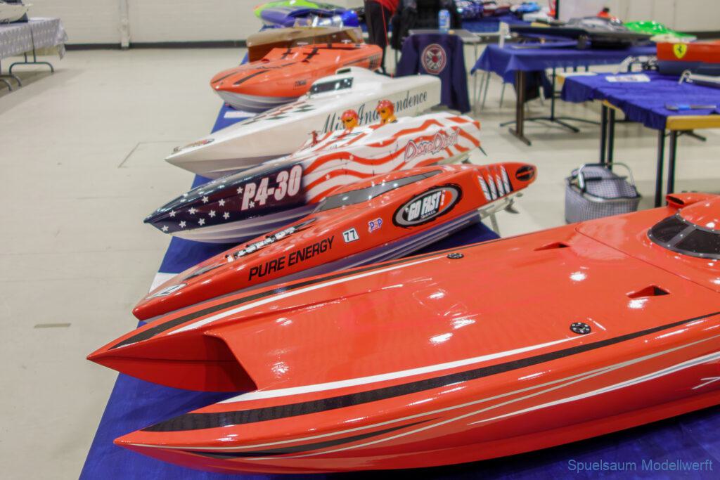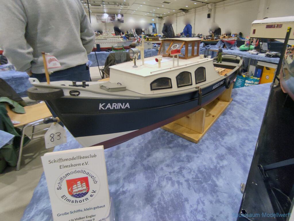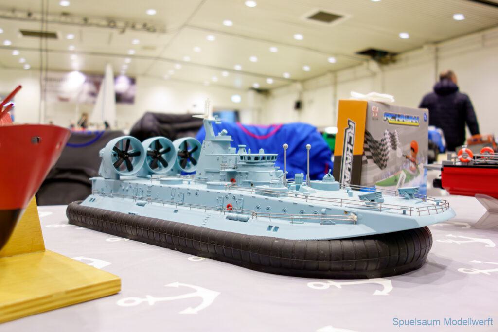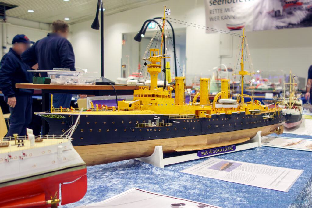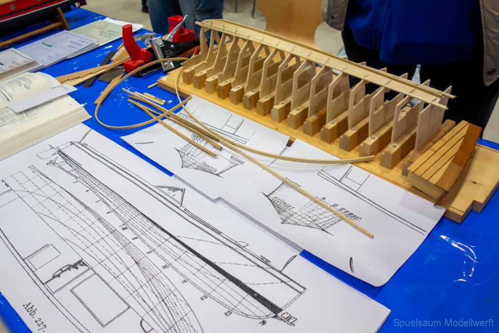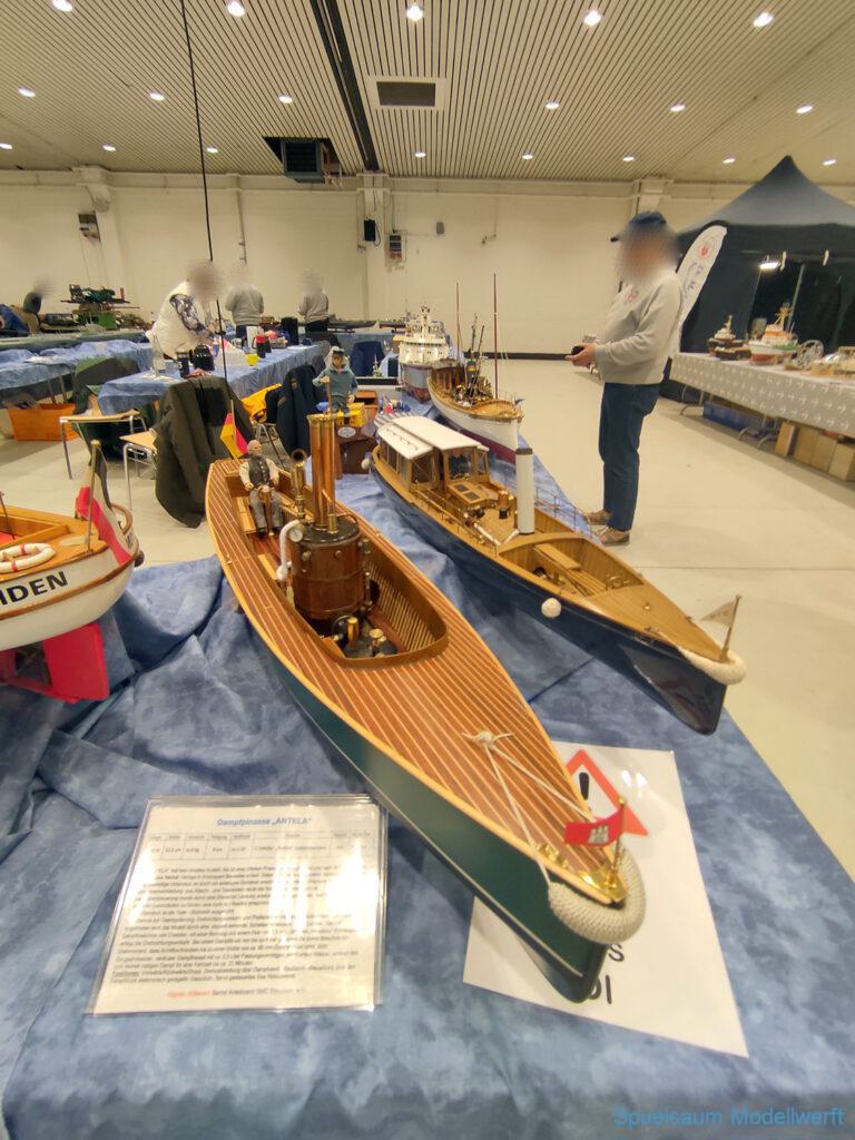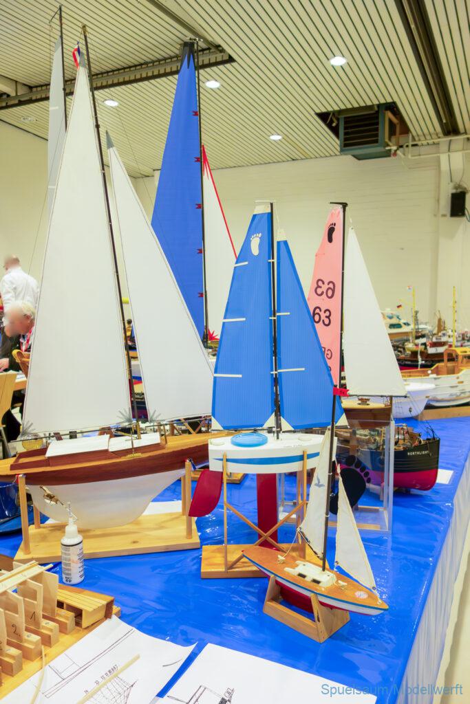 Ich habe wie immer mit dem SMC Elmshorn ausgestellt, dieses Jahr an beide Tagen. Prominent an vorderster Front, wobei das in der Halle doch relativ egal ist. Da wir viele große Boote im Verein haben und der Platz natürlich begrenzt ist blieben ca. 2,50m für mich, aber wie man sehen kann schaff ich es ohne Probleme auch diese ‚vollzumüllen‘. Bei mir gibt’s eben nicht nur die Boote sondern auch die Geschichte dazu (und ich hatte nochmehr dabei ;0) ). An Bootshaus hatte sich gegenüber Rostock im November nichts wesentliches geändernt, nur der Release-Haken war in der Montage etwas modifiziert, so daß nur eine Vorführung nicht geklappt hat (von unzähligen). Auch die Funktion der Winde wurde angefragt und vorgeführt. Das laufende Radar des Tyne, noch separat auf dem Tisch, habe ich nur mindestens 6 Mal auseinander genommen um den Getriebemotor zu zeigen. Da werde ich wohl noch ein zweites Radar bauen, nur für Ausstellungen (kein Hexenwerk, einfach nur Getriebemotor und Spannungsregler).