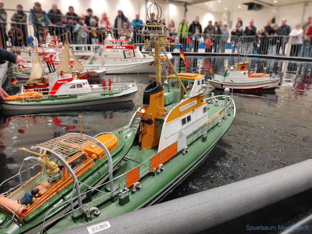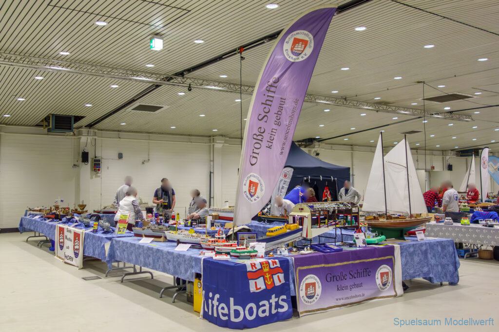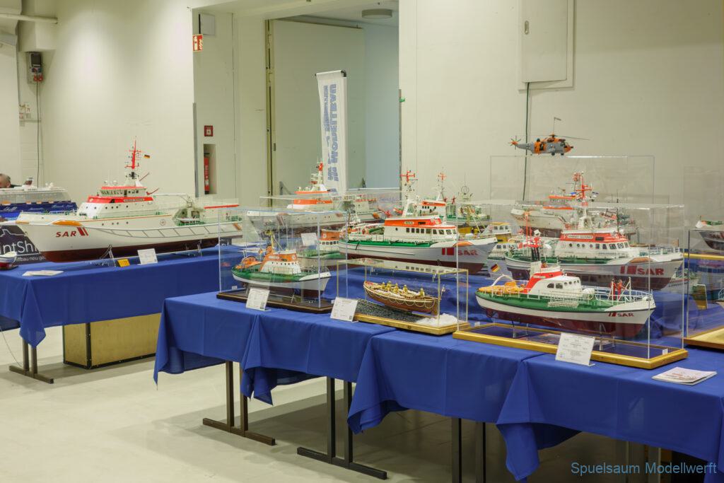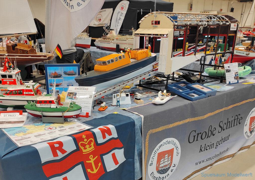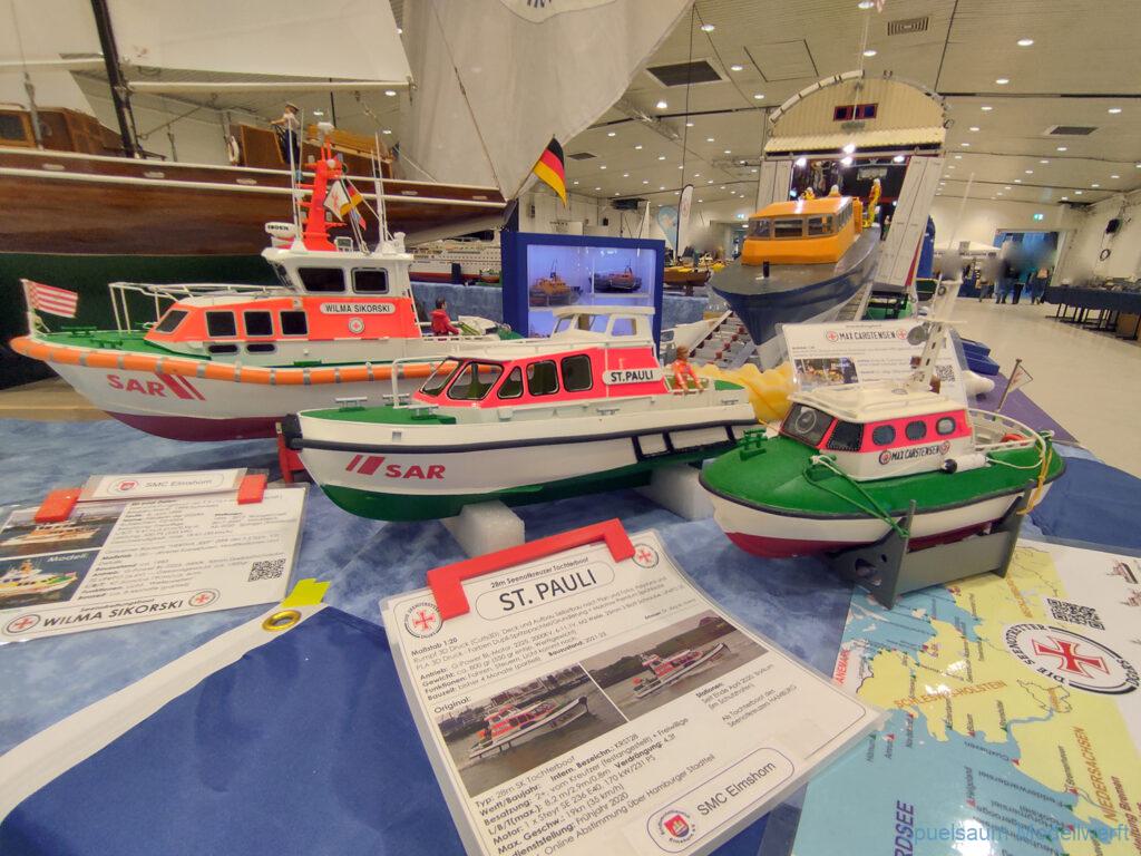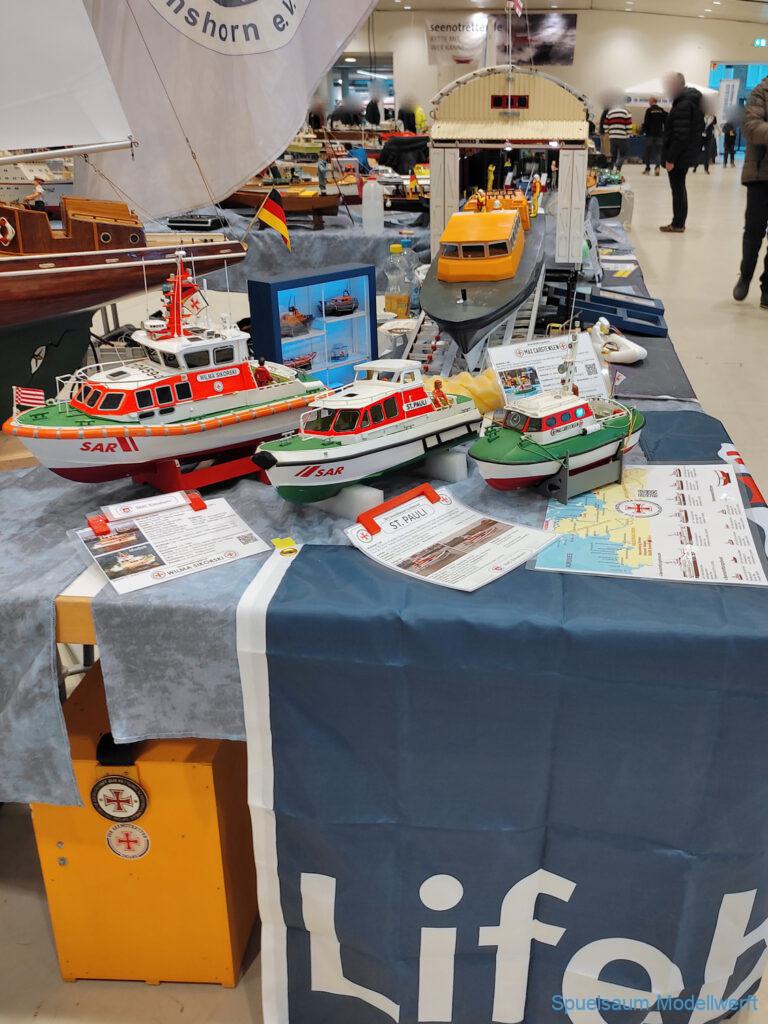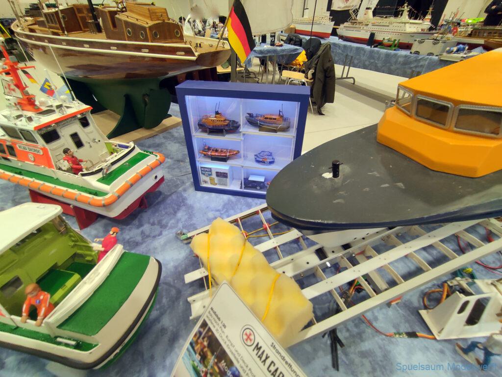 Nicht nur die Stimmung an unserem Stand war gut (und die Versorgung mit Brötchen, Würstchen und Kuchen – danke!), auch untereinander ging es locker zu. Viele Leute kennt man ja schon von anderen Veranstaltungen. Es lässt sich noch das eine oder andere lernen (immer wieder). Über Interesse an den Schiffen konnten wir uns nicht beklagen. Ab und an gingen die Gespräche zumindest bei mir dann auch mal auf englisch weiter. Mit etlichen Modellbaufreunden und Bekannten konnte aktueller Flurfunk der Seenotretter (nicht nur der DGzRS) ausgetauscht werden und über aktuelle und geplante Modelle wird geredet. Faszinierend finde ich immer wieder das Interesse and der WILMA SIKORSKI, die ja nicht das einzige dieses Modelltyps auf der Messe ist. Man merkt, das SRB von Graupner (jetzt PEBA) wird immer noch viel gebaut und liegt in vielen Kellen.