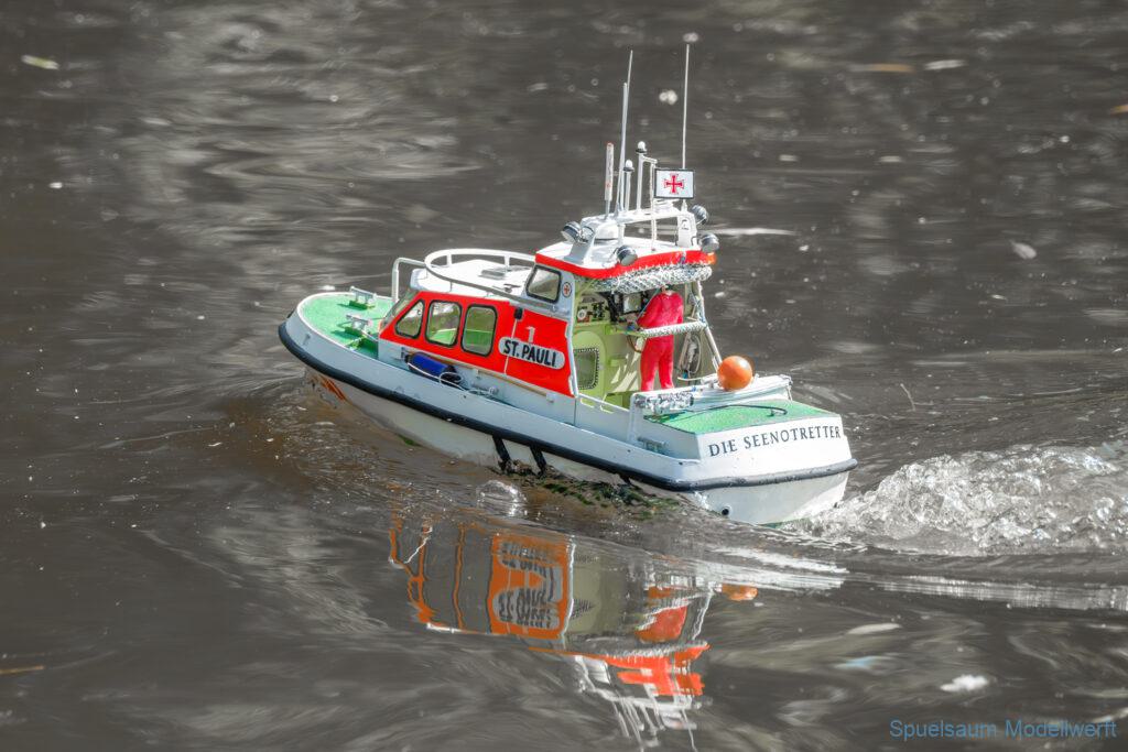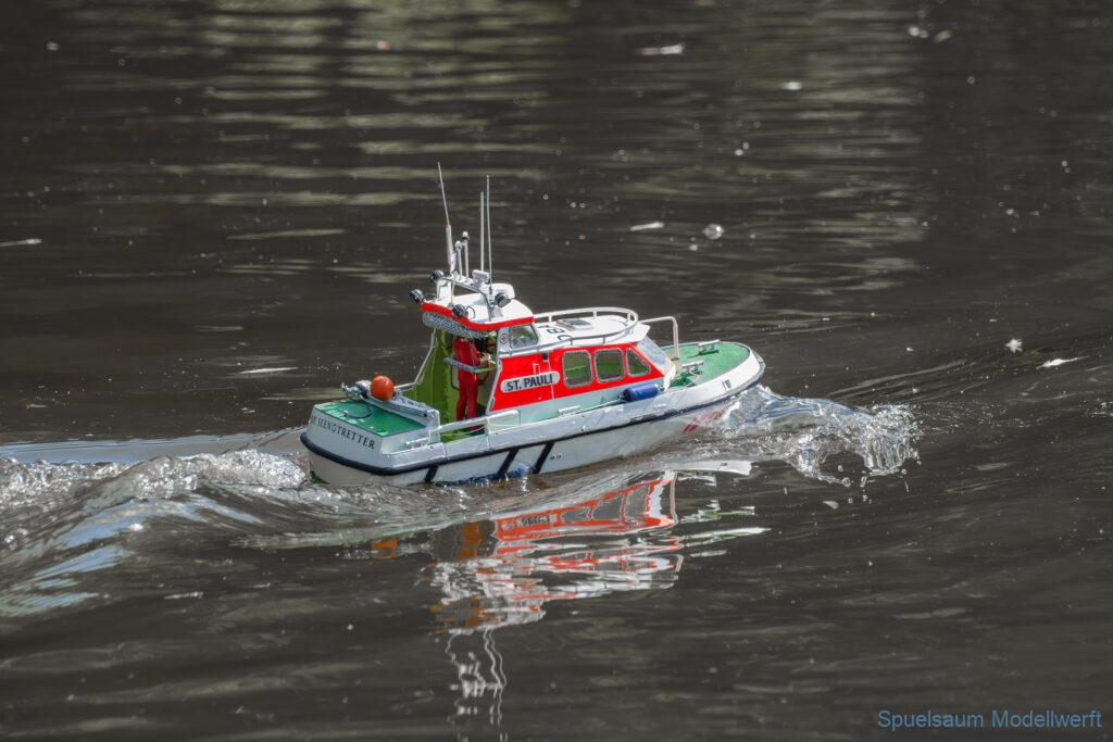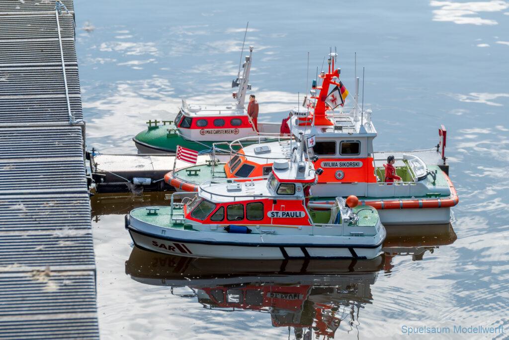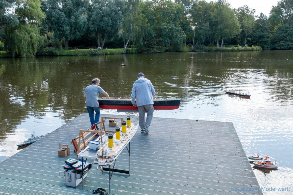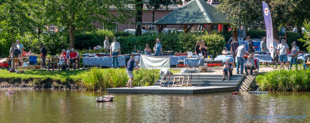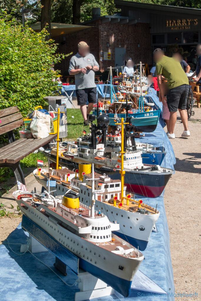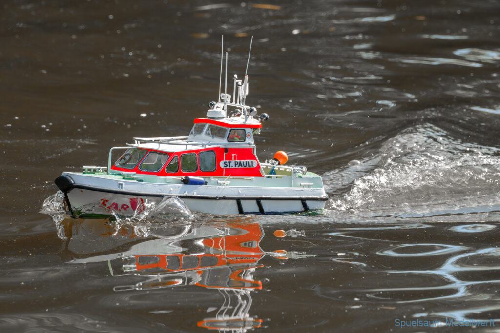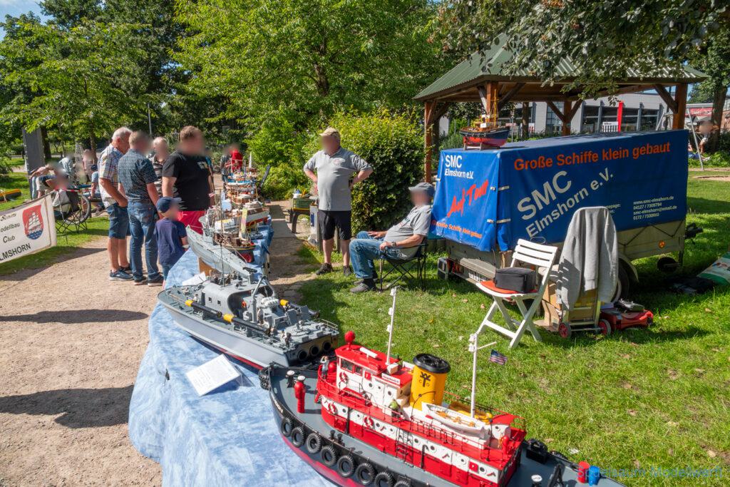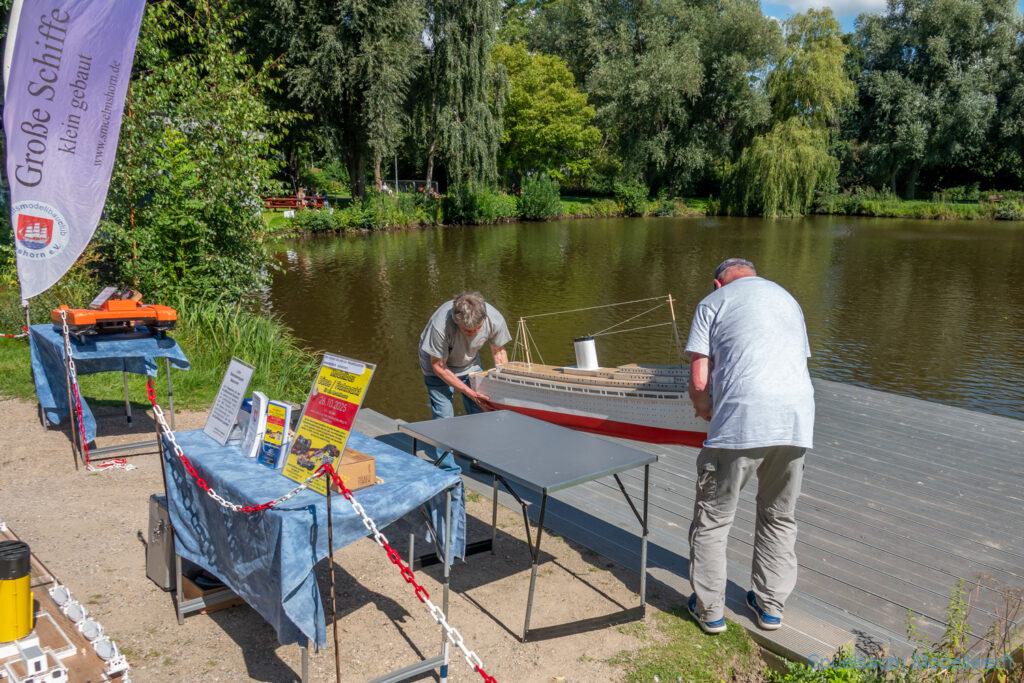 Bei dem Wetter war das Restaurant am See gut besucht, die dazu gehörigen Tische haben leider den guten Schattenplatz unter den Bäumen mit eingenommen. Hier und da konnte man sich aber unterstellen. Neben dem SMC Elmshorn waren auch noch Gäste vom SMC Hamburg den Modellschippers Neumünster und einige mehr gekommen. Es kamen so einige interessante Schiffe zusammen. Ich persönlich habe Besuch bekommen von der anderen Elbseite, die Glückstadt-Wischhafen Fähre ist nicht allzu weit weg. So wurde dann viel mit der WILMA SIKORSKI und der ST. Pauli gefahren, so daß am Ende tatsächlich beide ihre Akkus mal leergefahren hatten. Die Stimmung war prima, bis auf einige Radfahrer die meinten trotz Absperrung durchfahren zu müssen – willkommen in Deutschland. Dank Sonnenöl gings kurz nach 17 Uhr zurück nach Hause. ST. PAULI bringt einfach Spaß und auch die WILMA mit Gyro fuhr in diesem Wasser perfekt.