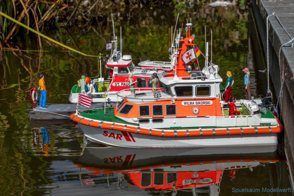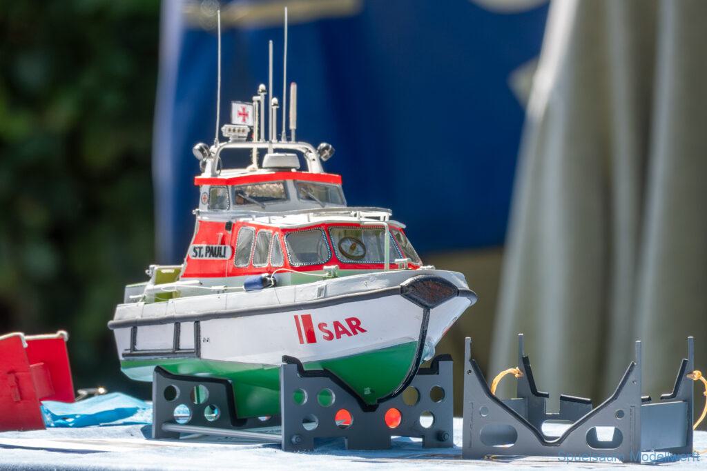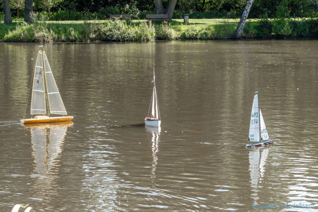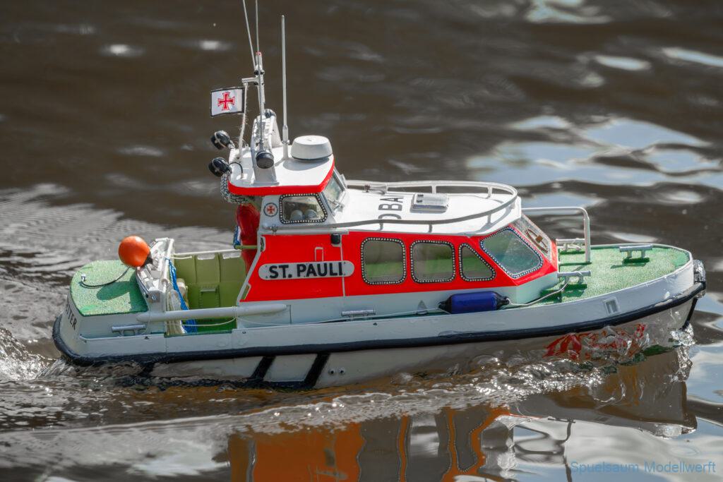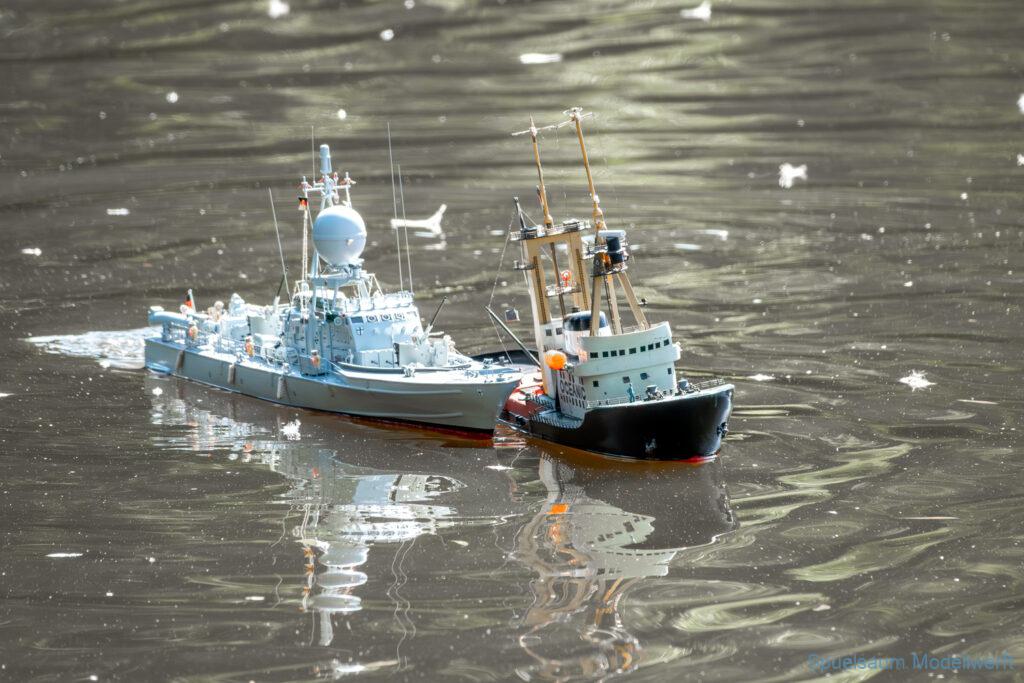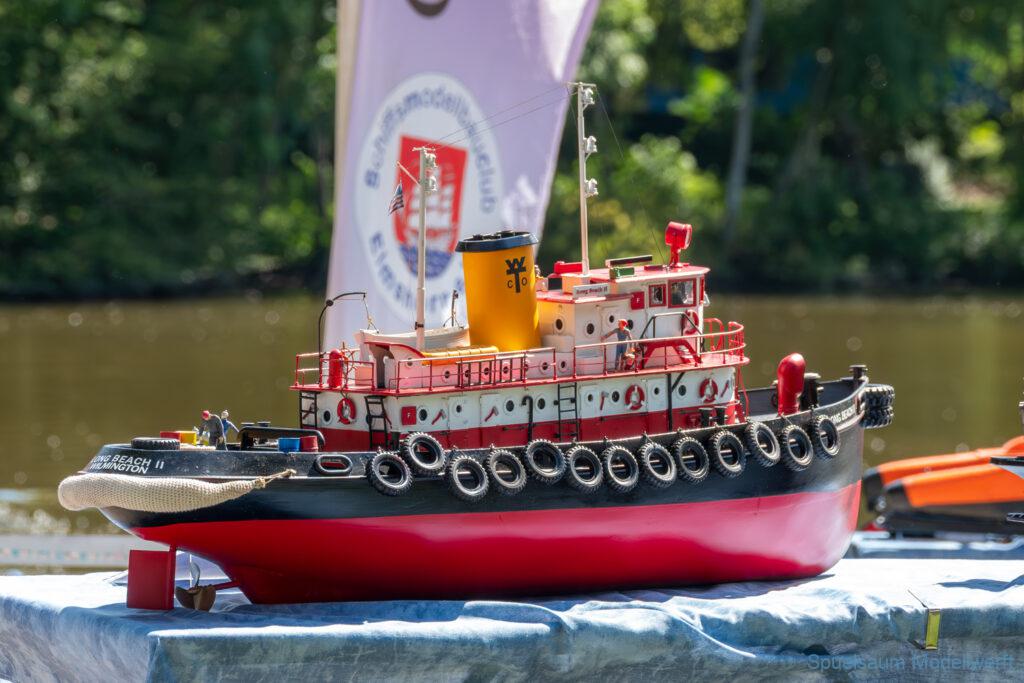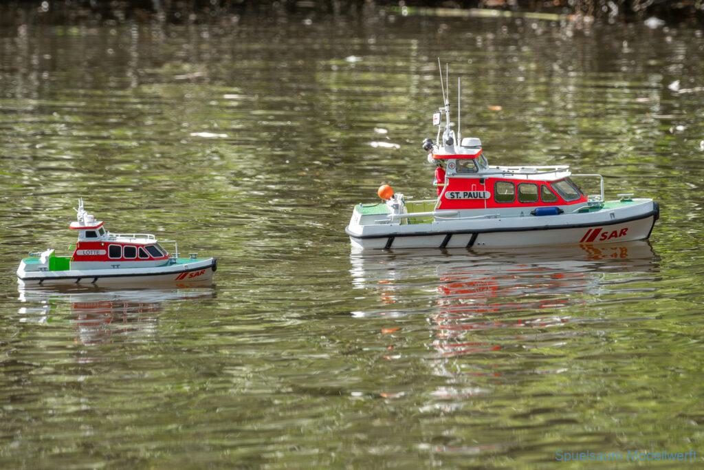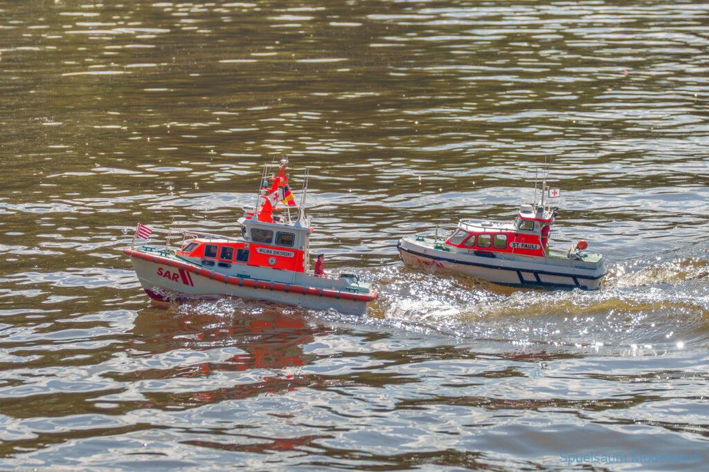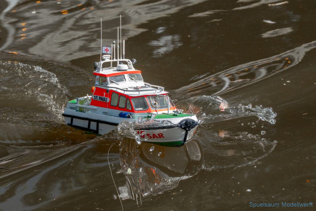 Bei dem Wetter war das Restaurant am See gut besucht, die dazu gehörigen Tische haben leider den guten Schattenplatz unter den Bäumen mit eingenommen. Hier und da konnte man sich aber unterstellen. Neben dem SMC Elmshorn waren auch noch Gäste vom SMC Hamburg den Modellschippers Neumünster und einige mehr gekommen. Es kamen so einige interessante Schiffe zusammen. Ich persönlich habe Besuch bekommen von der anderen Elbseite, die Glückstadt-Wischhafen Fähre ist nicht allzu weit weg. So wurde dann viel mit der WILMA SIKORSKI und der ST. Pauli gefahren, so daß am Ende tatsächlich beide ihre Akkus mal leergefahren hatten. Die Stimmung war prima, bis auf einige Radfahrer die meinten trotz Absperrung durchfahren zu müssen – willkommen in Deutschland. Dank Sonnenöl gings kurz nach 17 Uhr zurück nach Hause. ST. PAULI bringt einfach Spaß und auch die WILMA mit Gyro fuhr in diesem Wasser perfekt.