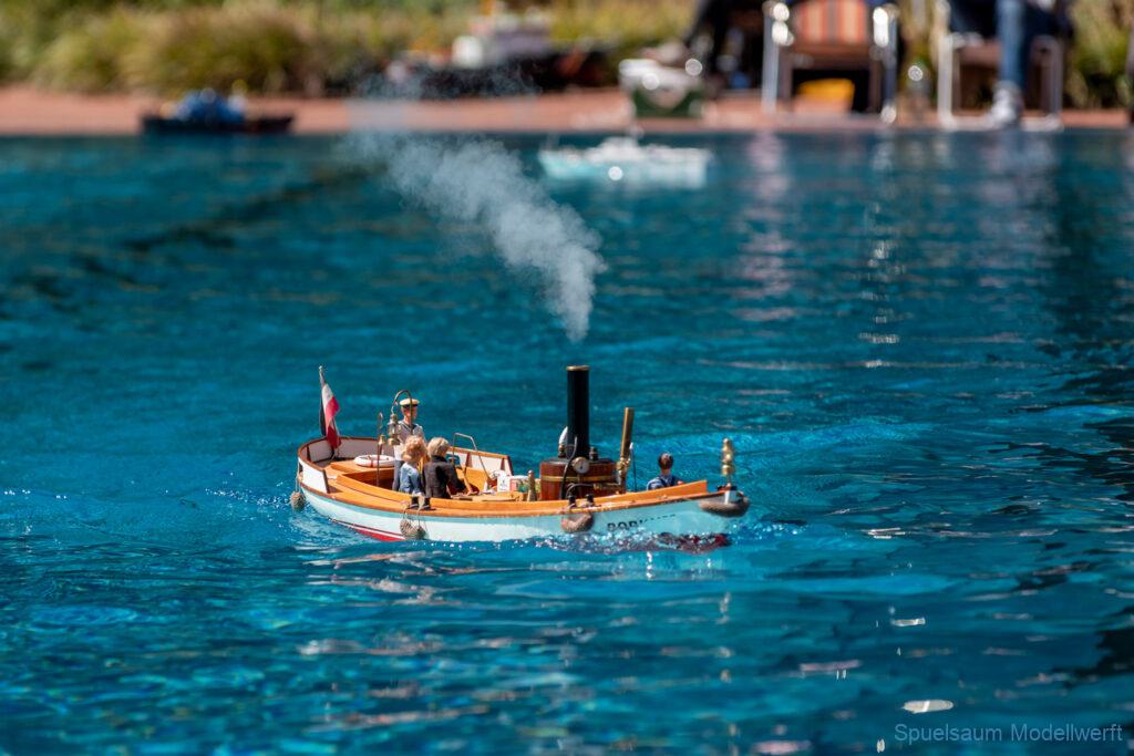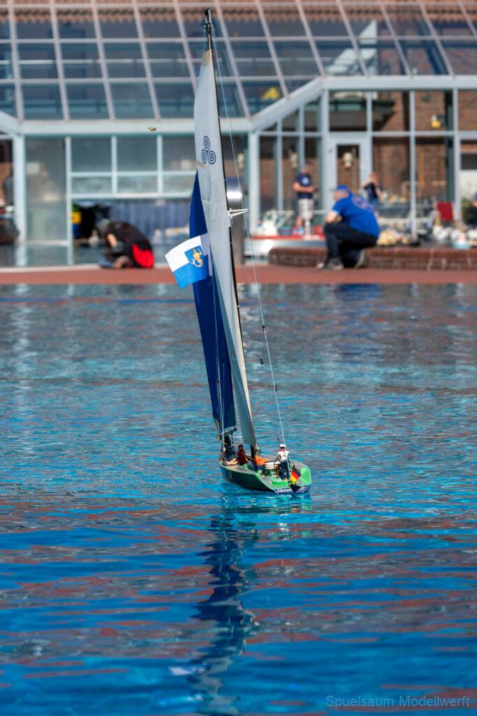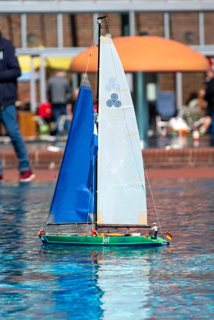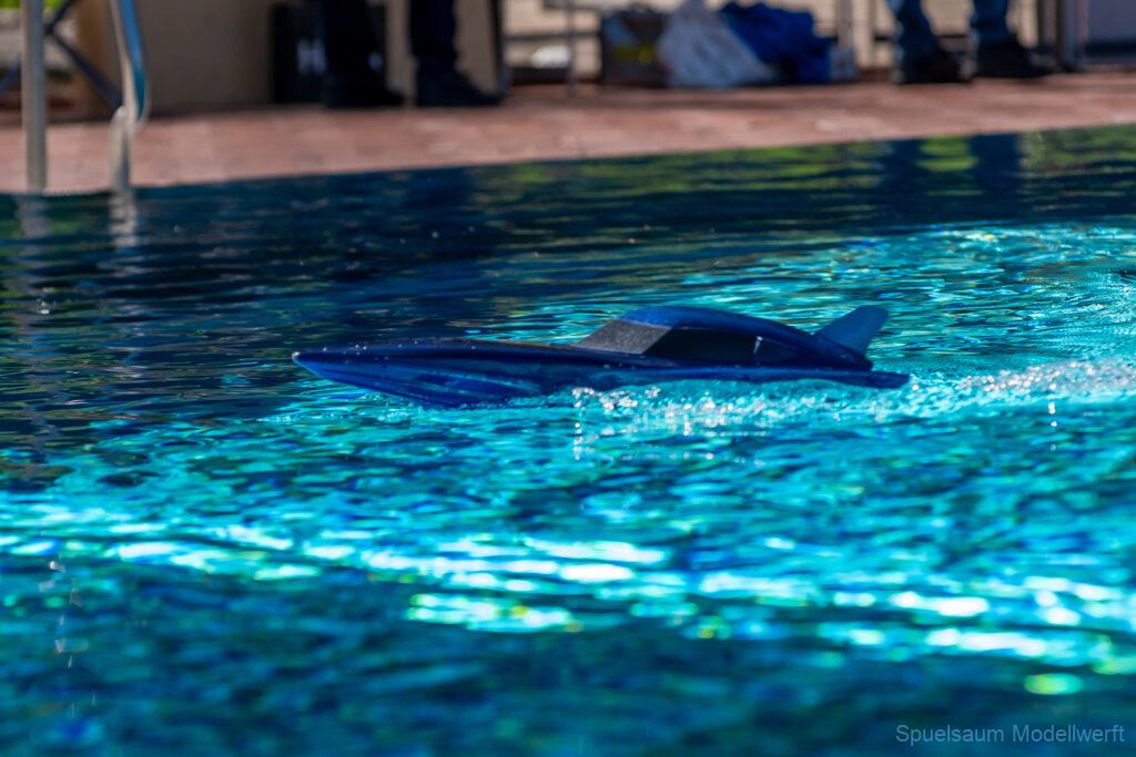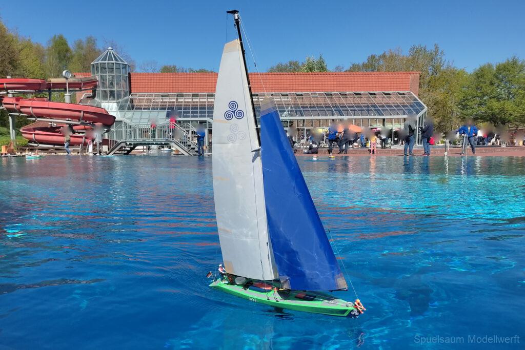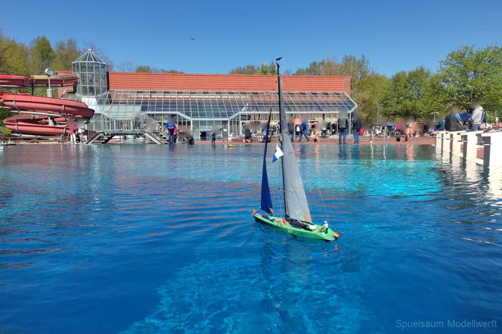 Bestes Wetter, Sonnencreme drauf und über die erstaunlich leere Autobahn (hinter Itzehohe musste man die Mitfahrer fast suchen) ging es nach Burg ins Waldfreibad. 9:00 war Treffpunkt mit den Mitstreitern vom SMC Elmshorn. Der Schwimmbad-Parkplatz war bereits gefüllt mit unzähligen Campern die bereits Freitag angereist waren. Um die Ecke am Sportplatz waren aber noch genug Parkplätze. Wir kamen mit unseren Tischen hinten zum Sprungturm, was uns bis Mittags Schatten garantiert hat. Im großen Spaßbecken war die große Hafenanlage aufgebaut und bis 11 Uhr füllte sich das Gelände mit vielen Bekannten und deren Schiffen. Wie üblich wird so ein Treffen gern genutzt um die Bastel-Früchte des Winters endlich einmal richtig auszuprobieren. Die Gefahr ist ja auch gering, das man ins Wasser oder ein Schlauchboot aufpumpen muss. Irgendwann treibt das Boot an Land und wenn es untergeht dann gibt’s ja noch Holger von Subwaterfilm.