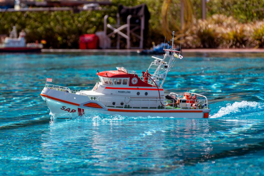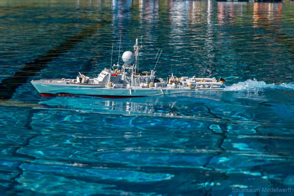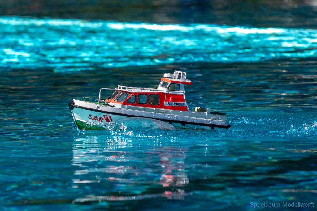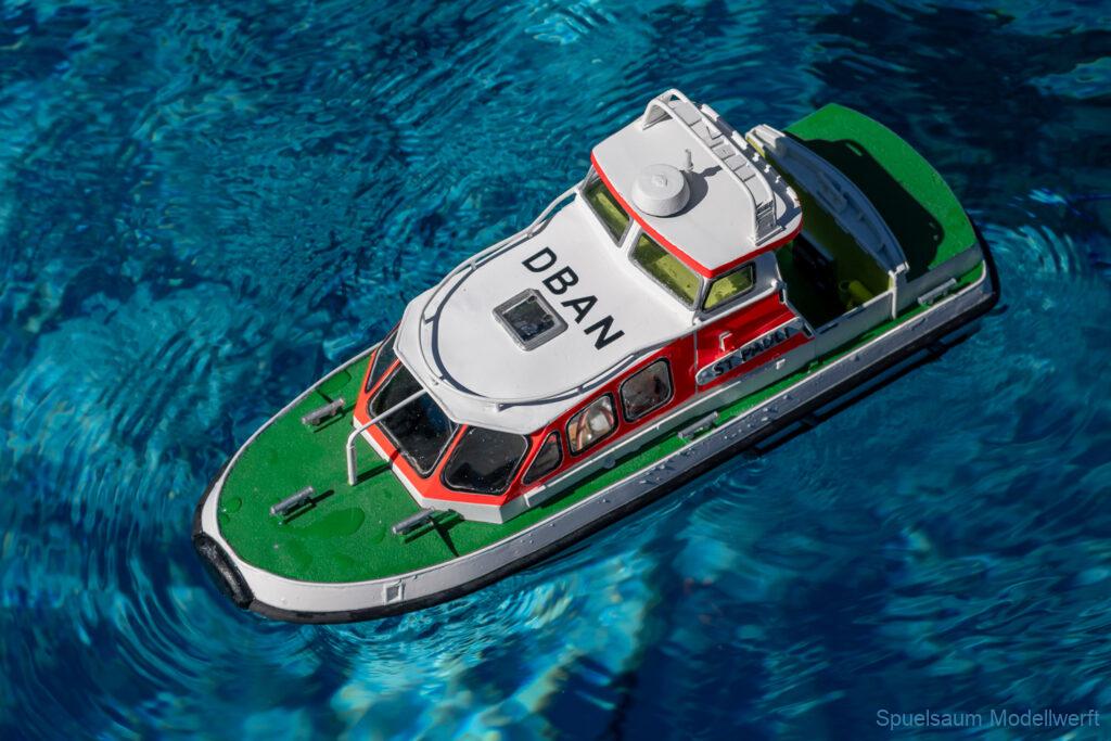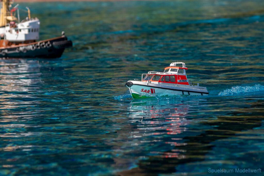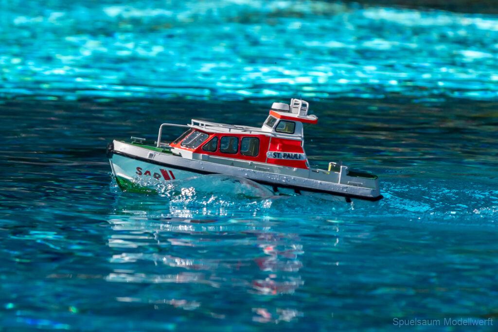 Bei mir war die kleine ST. PAULI dran zu zeigen was sie im richtigen Wasser kann. Die letzte Woche wurden die Fenster eingeklebt und am Freitag bis Abends noch die Stoßschutzleiste der Frontfender und etliche Aufkleber montiert. Das Fahrbild ist für mich perfekt, da brauche ich nichts an Motor, Schraube oder Einstellungen ändern. Die Sprayrails am Bug tun was sie sollen und die ‚Spurlage‘ ist auch deutlich besser als bei der WILMA. Ein richtiges Spaßboot. Nur mit den Fotos hat es nicht ganz so geklappt, der Autofokus war zu langsam.