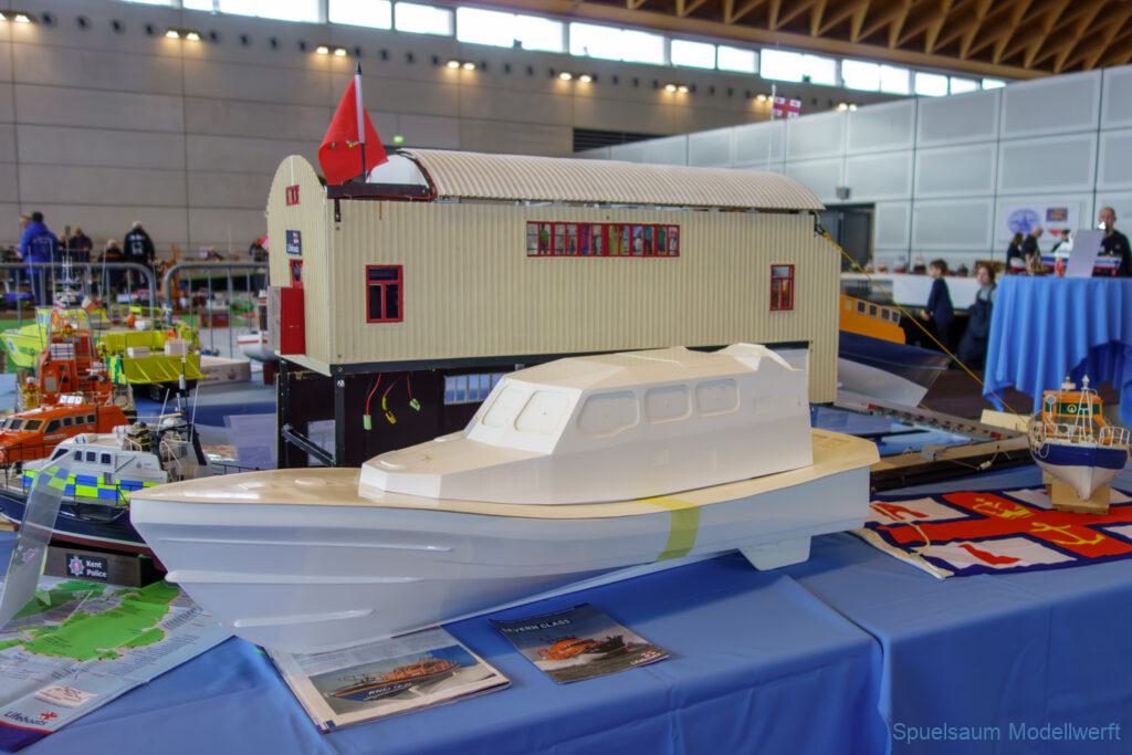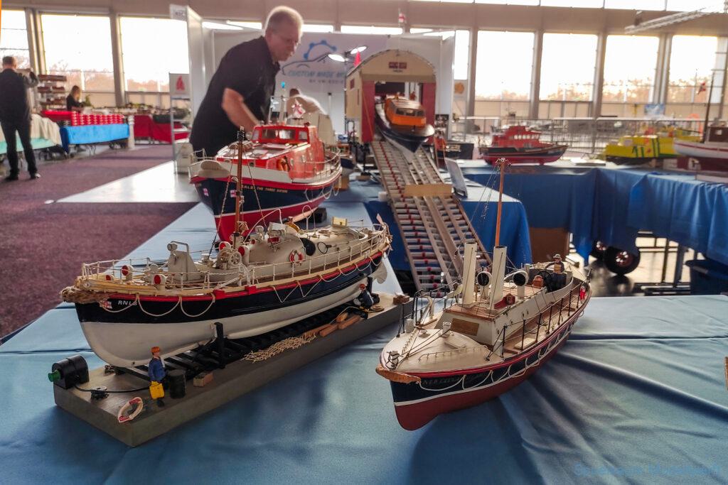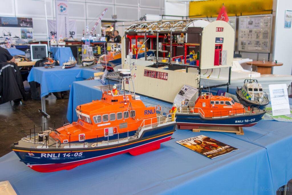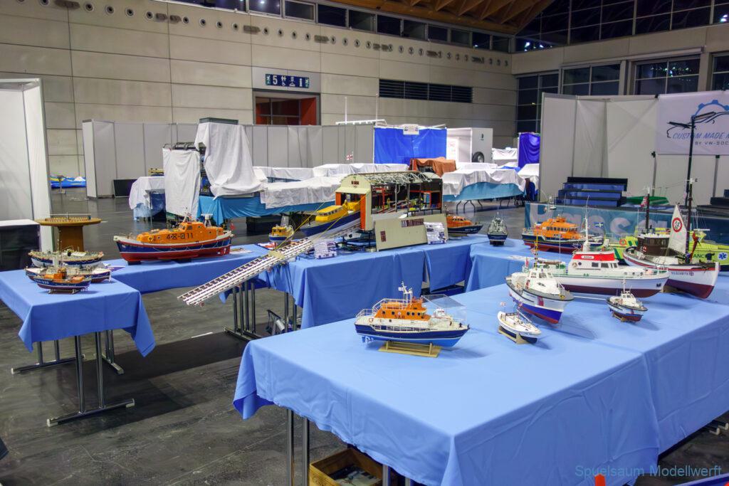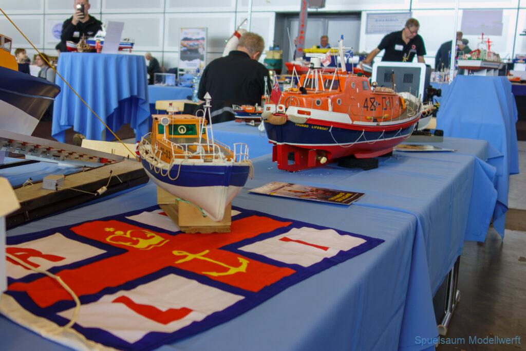 Schließlich war da noch unser Stand, für den wir 11x5m2 Grundfläche füllen durften. Da wir das Gespräch suchen und gerne über die verschiednen Seenotrettungsorganisationen erzählen und Diskutieren haben wir uns für zwei offene Inseln und ein offenes U entschieden. Unsere Schiffe waren von 3cm Papiermodellen bis zum 1,15m langen 1:12 Shannon Bausatz in vielen Variationen vorhanden. Die Berlin, das Schwesterschiff der in Warnemünde liegenden Arkona war diesmal als BlueBrixx Modell vertreten. Die DGzRS war mit Ponton und kleinen 9,5m SRBs (das nächste liegt in Kühlungsborn) und vielenne knuffigen ehemaligen Motor- oder Strandrettungsbooten vertreten. Zu einer Anzahl englischer RNLI Booten aus verschiedenen Epochen kamen noch ein schwedisches Ambulanz Boot, US Coast Guard und ein norwegischer Rettungskutter.