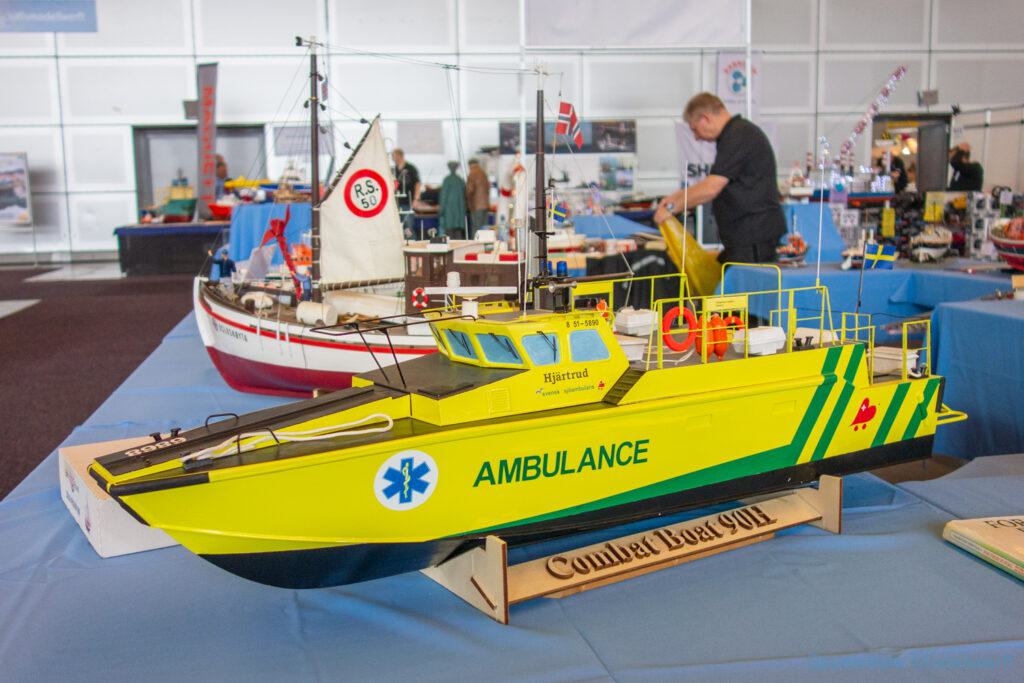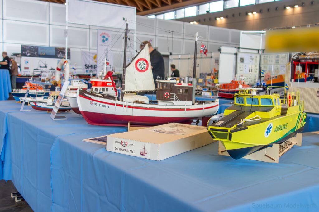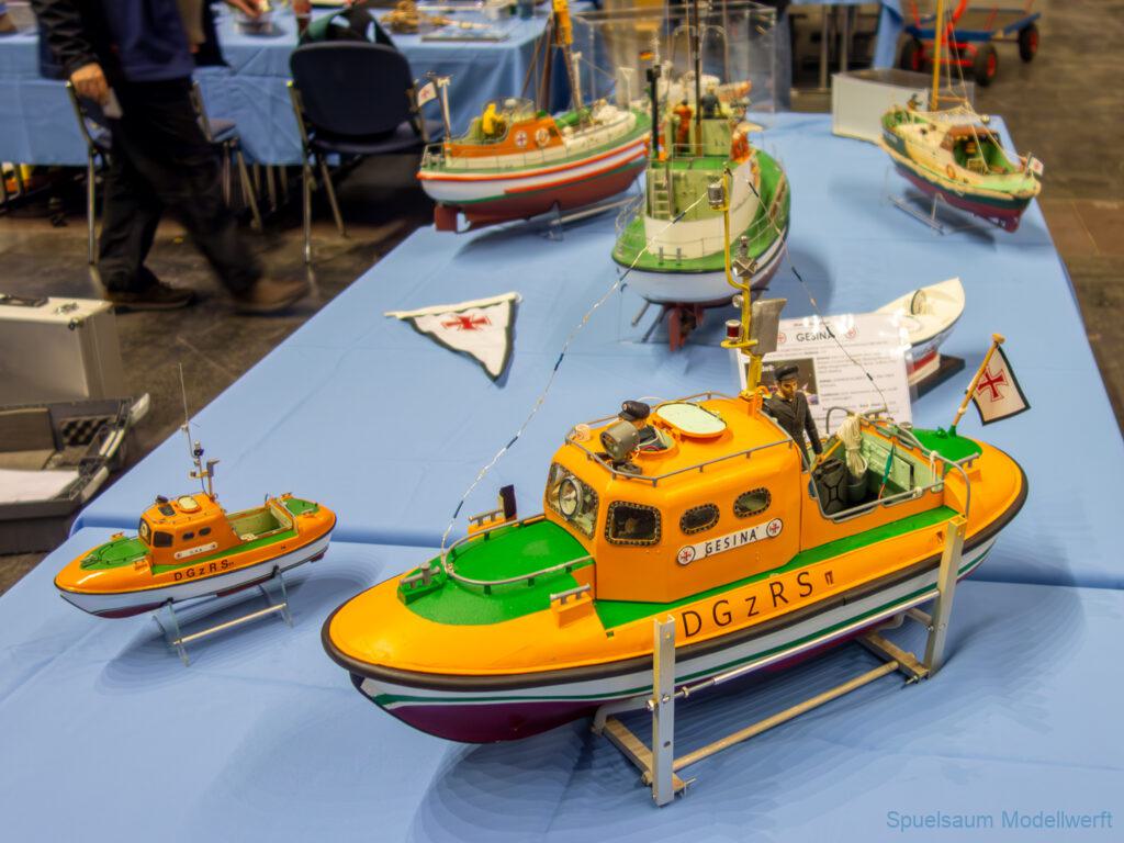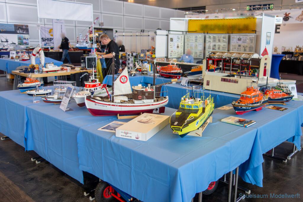 Schließlich war da noch unser Stand, für den wir 11x5m2 Grundfläche füllen durften. Da wir das Gespräch suchen und gerne über die verschiednen Seenotrettungsorganisationen erzählen und Diskutieren haben wir uns für zwei offene Inseln und ein offenes U entschieden. Unsere Schiffe waren von 3cm Papiermodellen bis zum 1,15m langen 1:12 Shannon Bausatz in vielen Variationen vorhanden. Die Berlin, das Schwesterschiff der in Warnemünde liegenden Arkona war diesmal als BlueBrixx Modell vertreten. Die DGzRS war mit Ponton und kleinen 9,5m SRBs (das nächste liegt in Kühlungsborn) und vielenne knuffigen ehemaligen Motor- oder Strandrettungsbooten vertreten. Zu einer Anzahl englischer RNLI Booten aus verschiedenen Epochen kamen noch ein schwedisches Ambulanz Boot, US Coast Guard und ein norwegischer Rettungskutter.