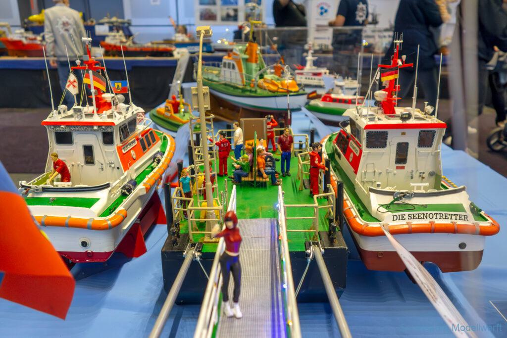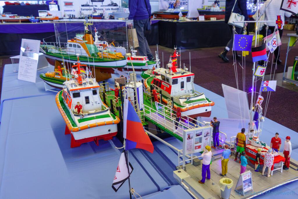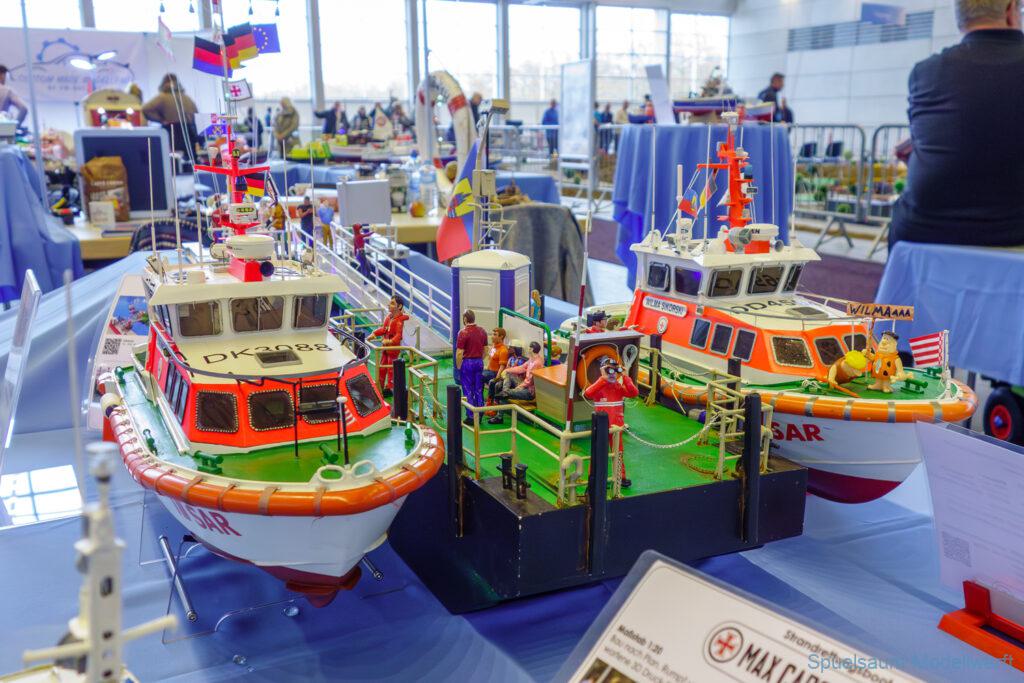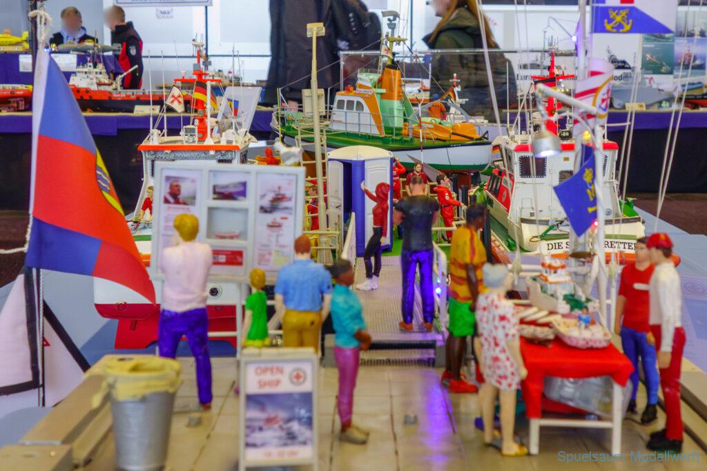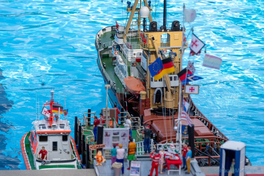 Für den Pontonteil sind hinten im Schwimmkörper zwei Einschlagmutter eingegossen um die Rohre zur Landseite verschrauben. Der Pontonteil selbst ist eine eigenständige Platte welche auf den Schwimmkörper aufgesteckt wird. Auf Landteil und Ponton sind Magnete unter die Oberfläche geklebt, damit kann ich Equipement und Figuren an verschiedenen Stellen platzieren (Tag der Seenotretter, Open Ship), oder auch nicht.