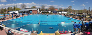 Da das 1m langen Bootshaus senkrecht zum Beckenrand stehen muss, habe ich mich neben der Rutsche platziert. Ich wollte ja einiges ausprobieren und dort war deutlich mehr ‚Luft‘ als direkt vor der großen Hafenanlage. Schon während des Aufbaus war ein Team vom NDR da und hat gefilmt. So hat’s das Tyne nicht ins Fernsehen geschafft, ist aber nicht schlimm weil es ja noch lang nicht fertig ist. Dafür hat Holger von >Subwaterfilm ausgiebig ein paar Slipway Rutscher gefilmt.