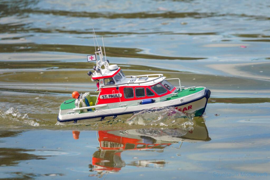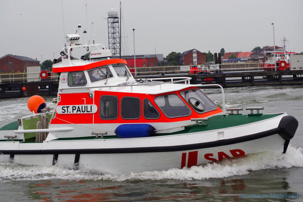 Nach drei aufeinander folgenden Urlauben auf Borkum, inklusive einem Tag der Seenotretter, kam die Idee wenn schon keinen Kreuzer, dann vielleicht ein Tochterboot. Was liegt da näher als die kleine ST. PAULI. Eile hatte das Projekt nicht, der Kreutzer war ja gerade erst in Dienst gestellt und bei unserem ersten Besuch noch nicht einmal getauft. Im Herbst 2024 tauchte ein 3D Drucksatz auf, günstig und einfach zu drucken (also Druckzeiten unter 8h und wenig Stützmaterial). Insgesamt wurde das Druckprojekt aber zu schwer und der Aufbau gefiel mir bei Fahrstand und Plicht überhaupt nicht. So habe ich dann nur die Rumpfschale verwendet und Deck mit Aufbau und viele Details nach Plan und Fotos selbst erstellt. Nicht ganz Scale aber doch dicht genug am Original. Der Bau fand nach einer kontinuierlichen Anfangsphase nach längeren Pausen nur noch in mehreren intensiven Bauphasen kurz vor Veranstaltungen statt. Daher wurde auch kreuz und quer gebaut, teileise parallel an Aufbau, Deck und Dach.
